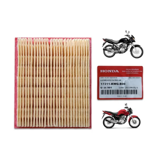 FILTRO DE AR ORIGINAL HONDA CÓDIGO HONDA: 17211-KWG-B00 APLICAÇÕES: NXR BROS 125 2013 A 2015 NXR BROS 150 2009 A 2014 CG FAN 125 2009 A 2013 CG FAN 150 2011 A 2013 CG TTIAN 150 2009 A 2013 POP110i 2016 A 2022 XRE 190 TODOS OS ANOS