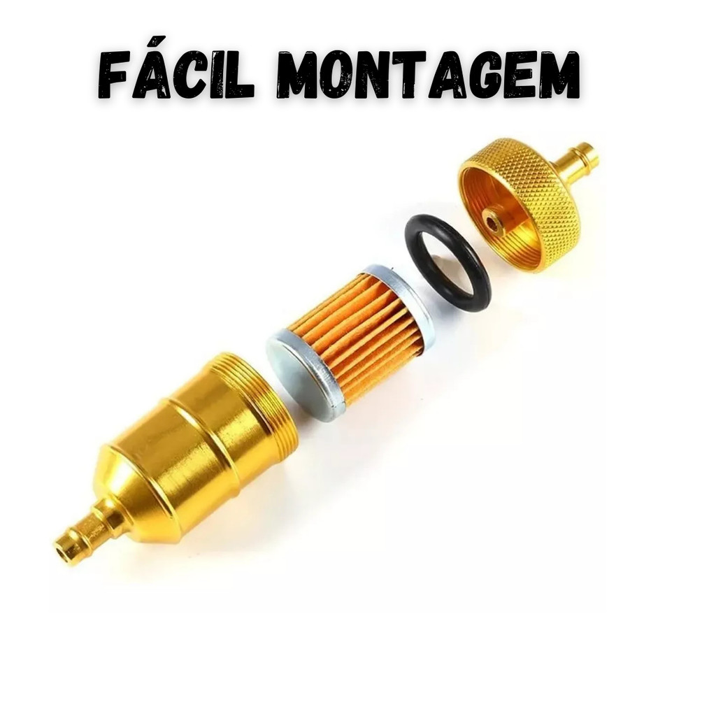 Filtro de Combustível Gasolina Moto Alumínio Universal O filtro de combustível tem a função essencial de reter impurezas, garantindo que a gasolina chegue ao motor limpa, proporcionando um melhor desempenho e evitando danos ao sistema de injeção ou carburador. Especificações: Compatível com motos de até 400 cc Modelo universal Produzido em alumínio anodizado, oferecendo alta durabilidade e resistência Lavável e reutilizável Usinado em torno CNC de alta precisão Dimensões: Comprimento total: 7,75 cm Comprimento do filtro: 4,8 cm Bico de entrada: 6,25 a 7,25 mm Bico de saída: 7 a 8 mm Garanta já o seu e proteja o motor da sua moto com um filtro de combustível de alta qualidade!