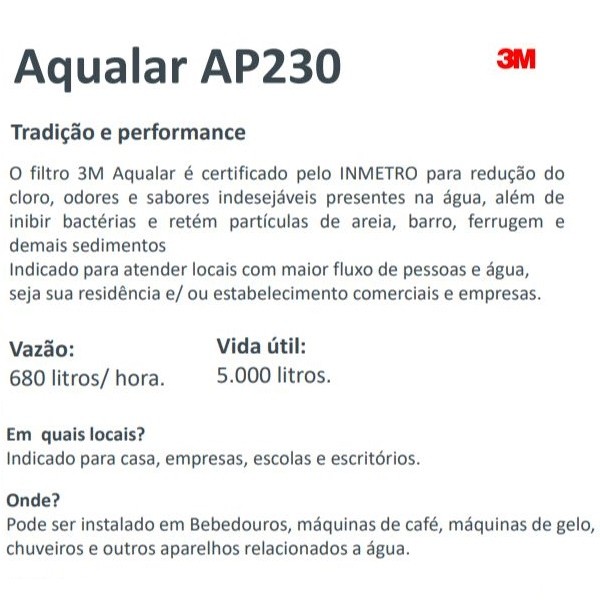 O filtro de água 3M Aqualar AP230 possui um sistema de tripla filtração com tecnologia 3M, que deixa a água livre de materiais particulados como areia, barro, ferrugem, poeiras e outros sedimentos, além de eliminar mais de 75% do gosto e cheiro do cloro (nota máxima do INMETRO em retenção de cloro) e manter o flúor, preservando assim a saúde bucal da sua família. Disponível na cor branco, filtro de água 3M Aqualar AP230 possui fluxo contínuo de água em temperatura natural, pronta para beber, fazer gelo, sucos, café, lavar os alimentos e cozinhar. O modelo AP230 se diferencia do modelo AP200 por funcionar com o dobro de vazão (680 litros por hora!). DESTAQUES: - Aprovado pelo INMETRO - Econômico: 1 refil equivale a 125 galões de 20 litros - Garantia: 2 anos - Manutenção fácil, prática e econômica - Contém prata coloidal, para manter o controle microbiológico do filtro EMBALAGEM: 01 Filtro de água AP 230. 01 Elemento filtrante AP 230. 01 Niple 1/2 polegadas. OBS: Instruções de instalação na própria embalagem.