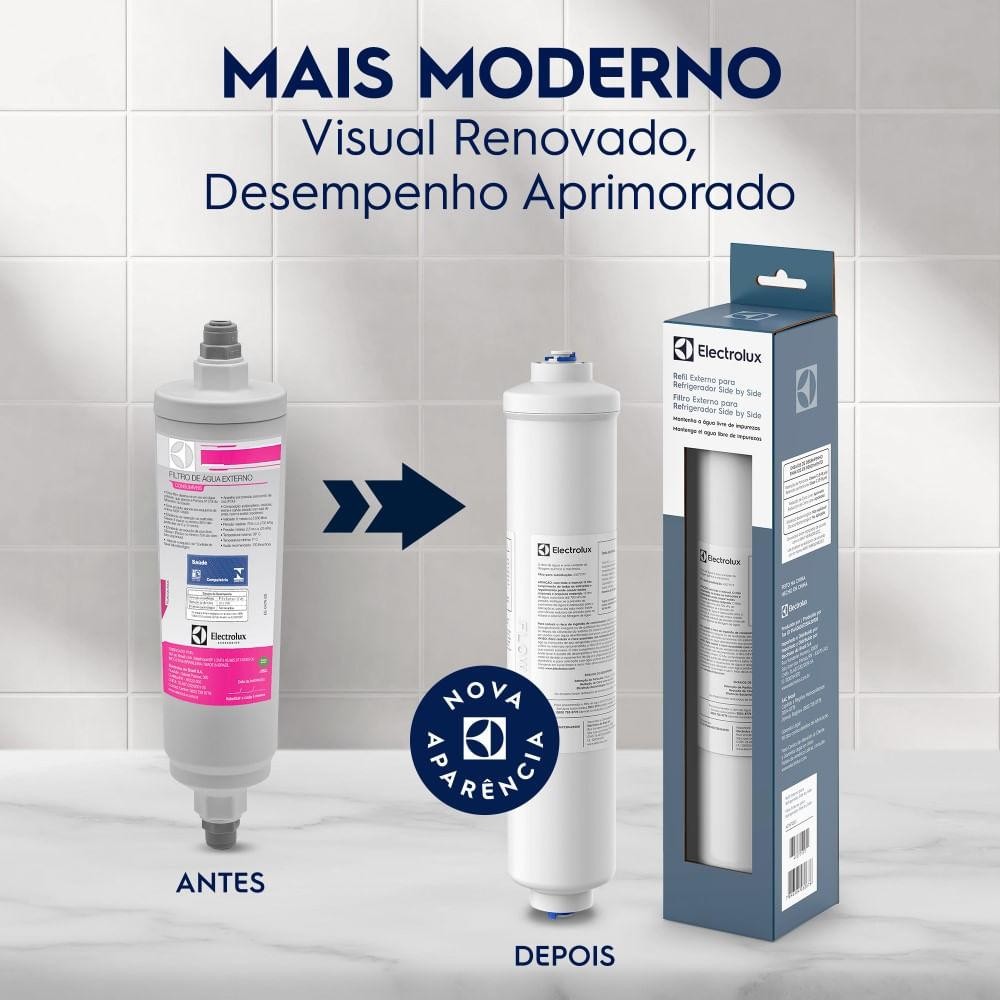 REFIL EXTERNO PARA REFRIGERADOR SIDE BY SIDE Mantém a água livre de impurezas O Refil Externo Para Refrigerador Side By Side garante água pura e preserva sua saúde. Com uma tecnologia de filtragem avançada, e aprovada por todos os critérios do Inmetro, possui eficiência comprovada na retenção de partículas, controle microbiológico e redução de cloro livre. Carvão Ativado O carvão ativado reduz o excesso de cloro livre na água, além de reduzir odores e sabores. Polipropileno A barreira de Polipropileno permite maior capacidade de retenção de contaminantes, reduzindo vários tipos de partículas sólidas e purificando ainda mais a água. Testado e aprovado - Retém micropartículas de 5 a 15 µm (partículas invisíveis a olho nu). - Reduz, no mínimo, 75% do cloro livre na água*. - Controle de nível microbiológico, garantindo água segura para o consumo. Vida útil Troque o Refil Original Electrolux a cada 1.000L ou 6 meses, o que ocorrer primeiro. Compatibilidade Verifique o código, modelo aplicado e compatibilidade. Aplicações: refrigeradores SS90X, SS91X, SS72X, SS72B, SH72X, SH72B, SH70X, SH70B e IS9S Atenção! Só use Refil Original Electrolux. O chamado refil compatível não é testado e aprovado pela Electrolux e coloca em risco tanto a qualidade da água que você toma como a vida útil e desempenho do seu refrigerador Electrolux. *Testes realizados de acordo com a norma ABNT NBR:16098:2012 e portaria 394/2014 do Inmetro. Classificação C para particulado.