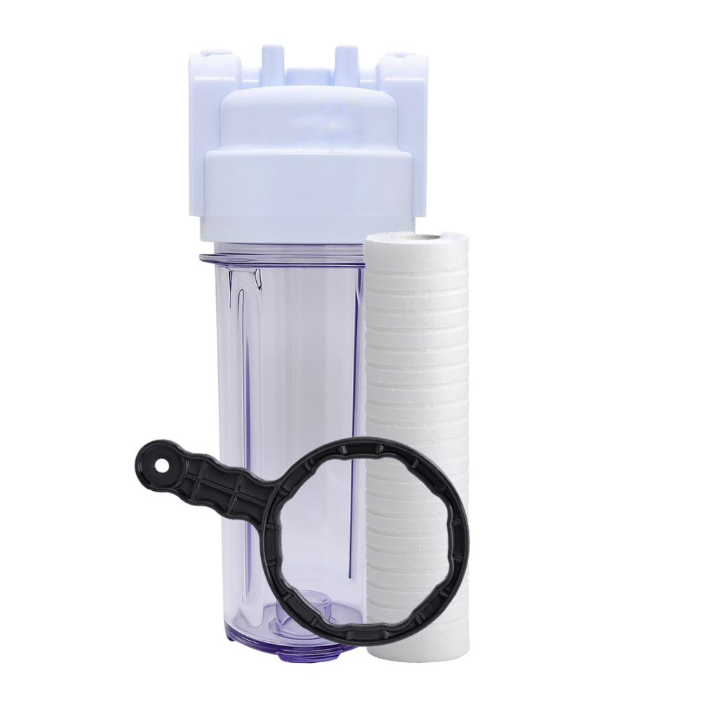 Filtro Água 10 Caixa Dágua Cavalete + refil PP +Chave Características •Marca E-COMIX •Modelo CATP250-3/4+PPL250 Dados Técnicos da Carcaça: Carcaça de polipropileno Vazão: até 1.200 L/H Pressão máxima de trabalho: até 7 Kgf/cm² Temperatura máxima de trabalho: até 60°C Dimensão externa: 120mm X 300mm Conexão de entrada e saída: rosca 1/2 ou 3/4 Compatível para filtros cartucho modelo: 10" - 9 ¾” - 9 7/8” Cores: Azul, Fume, Transparente ou Branca Dados Técnicos do Elemento Filtrante: Refil de polipropileno liso Vazão: até 1.200 L/H Pressão máxima de trabalho: até 7 Kgf/cm² Temperatura máxima de trabalho: até 60°C Principal aplicação: Retenção de partículas sólidos em água e líquidos em geral. KIT CONTEM: 01 Carcaça 01 Refil PP 01 Chave