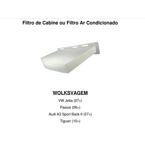 Filtro de ar condicionado para os veículos: Jetta 07 --->>> Passat 06 --->>> A3 Sport Back II 07 --->>> Tiguan 10 --->>> Audi A3 Qual a importância de trocar o filtro de ar condicionado? A necessidade de trocar o filtro não só existe como é de extrema importância. Afinal, o ar que você respira dentro do carro passa por ali e, quanto mais sujo ou velho ele estiver, pior será a qualidade do ar no interior do carro. O filtro tem a função de reter poeira, fuligem e eliminar qualquer tipo de impureza do ar.