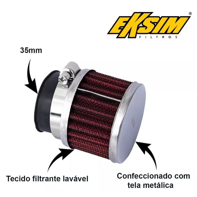 Os filtros Eksim seguem os padrões das peças originais, utilizando tecnologia de ponta e materiais de altíssima qualidade. A linha de produtos é completa e garante o melhor funcionamento do motor, trazendo muito mais durabilidade. A função do filtro de ar esportivo é a mesma que um filtro de ar padrão, porém o diferencial dele é que a peça consegue colocar mais ar para a câmara de combustão dentro do motor. Isso faz com que o veículo consiga realizar uma maior queima de combustível, consequentemente ele ganha um pouco mais potência. Compatível com: HONDA: Biz 125 2006-2008 C100 Biz 1998-2005 C100 Dream 1992-1998 DAFRA Zig 50 Zig 100 Super 50 Super 100 YAMAHA Crypton 105 1998-2005 Crypton 115 2010-2016 Neo 115 2005-2007 Outras aplicações compatíveis: Traxx, Mobilete, Jog50, Shineray 50 Especificações Técnicas: - Confeccionado com uma tela metálica e tecido filtrante; - Lavável - Possui braçadeira; - Maior durabilidade que os filtros comuns - Permite uma melhor passagem do ar - Ganho de desempenho em até 07% - Aumento do fluxo de ar em até 28% - Produzido em metal inoxidável - Durável Importante: - Recomendamos que a troca seja feita por um profissional de sua confiança!