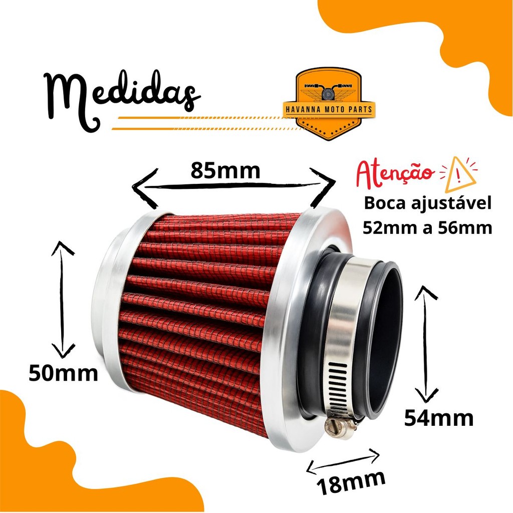 Os filtros Eksim seguem os padrões das peças originais, utilizando tecnologia de ponta e materiais de altíssima qualidade. A linha de produtos é completa e garante o melhor funcionamento do motor, trazendo muito mais durabilidade. A função do filtro de ar esportivo é a mesma que um filtro de ar padrão, porém o diferencial dele é que a peça consegue colocar mais ar para a câmara de combustão dentro do motor. Isso faz com que o veículo consiga realizar uma maior queima de combustível, consequentemente ele ganha um pouco mais potência. Compatível com: FUSCA CARBURADO ( carburador simples ou duplo ) Código Original (OEM) do Filtro: 17213-KPF-960 Especificações Técnicas: - Possui braçaceira; - Diâmetro de entrada: 53mm - Confeccionado com uma tela metálica e tecido filtrante; - Lavável - Maior durabilidade que os filtros comuns - Permite uma melhor passagem do ar - Ganho de desempenho em até 07% - Aumento do fluxo de ar em até 28% - Produzido em metal inoxidável - Durável - Bocal: 52mm - 53mm - 54mm -55mm - Diâmetro cônico: 74mm - Altura: 80mm Importante !! - Recomendamos que a troca seja feita por um profissional de sua confiança! - Não nos responsabilizamos pelo mau uso do produto.