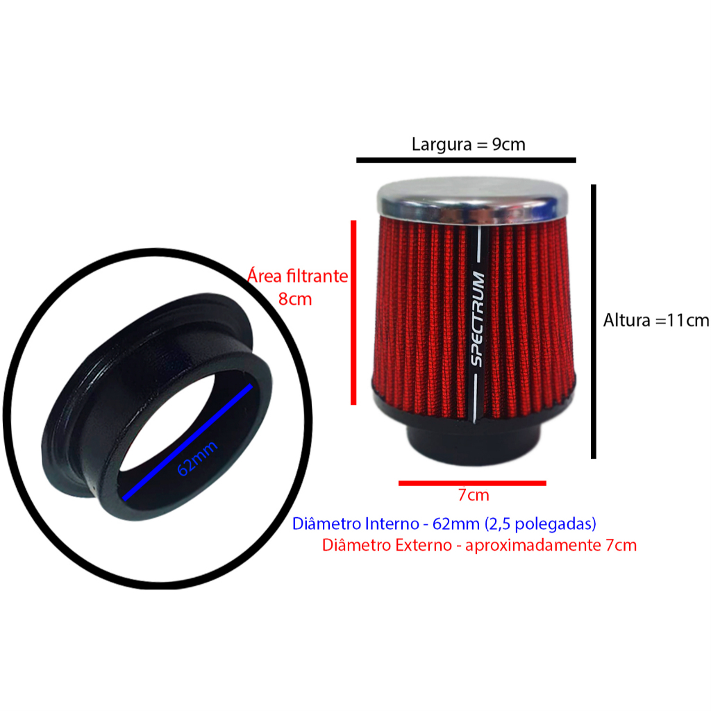 Indicado para: 52mm: Fox, Fusca, Gol, Kombi, Saveiro, Up, Parati, Ecosport, Fiesta, Rocam, Ka, Celta vhs, Corsa vhc, Captur, Clio, Duster, Etios, Kicks, Kwid, March, Sandero, Versa, Yaris,etc. 62mm: Golf, Jetta, Passat, Polo, Santana, Virtus, Voyage, Focus 1.6, Argo, Bravo, Linea, Palio (1.0, 1.3, 1.4 e 1.6 16V), Punto, Siena, Stilo, Strada, Toro, Uno 1.0, Astra, Cobalt 1.4, Corsa (1.0 e 1.4 8V/16V), Cruze, Montana, Omega, Onix, Vectra, Peugeot 206, 207, 208, Audi A3, BMW 320, Citroen C3, Honda City, Civic, Jeep Compass, Renegade, Creta, Frontier, HB20, i30, IX35, L200, Lancer, BMW X1, etc. 76mm: Fusion, ASX, Corolla, C4 Pallas, etc. OBS: Verifique se o diâmetro da tubulação original do veículo é compatível com a do filtro de ar esportivo. Até mesmo os modelos acima podem variar a medida de acordo com o ano, modelo e potência do motor, a melhor garantia é medir. Especificação Técnica: • Modelo Cônico: Permite Aumento no Rendimento do Motor • Tecido Filtrante Lavável para Maior Eficiência com Revestimento em Tela de Aço • Base de Borracha e Tampa Cromada • Aumenta a Potência do Motor em Média Até 7cv Devido a Maior Captação na Entrada de Ar • Proporciona Melhor Queima de Combustível e Ajuda a Diminuir a Emissão de Gases Poluentes • Oferece Menor Desgaste dos Componentes Internos do Motor • Maior Durabilidade e Qualidade de Filtração • Durabilidade: Até 2 anos, filtro lavável. • Dimensões (HxL): 11x9 Dicas de Instalação: • Remova a tampa do compartimento e retire o elemento filtrante original; • Faça a conexão do produto junto ao motor, utilizando uma braçadeira; • Para evitar que o filtro de ar vibre, você pode usar cintas plásticas abraçadeiras de nylon; • Evite a instalação do produto próxima ao bloco do motor; • Para uso em estradas de terra e off road, utilize uma capa protetora de filtros, aplicando uma leve camada de spray lubrificante. Dicas de Manutenção: • É recomendada a limpeza do filtro de ar a cada 3 meses ou 5.000km; • Para realizar a lavagem do filtro de ar, segure o produto sempre pelo bocal, mergulhando-o diversas vezes em um recipiente com água e detergente; • Repita essa operação até que a água fique escura, removendo a sujeira; • Renove a mistura de água e detergente, repetindo a operação; • Deixe secar ao ar livre; • Nunca deixe o filtro de ar esportivo de molho, não aplique nenhum tipo de solvente ou utilize qualquer tipo de secador ou soprador térmico.
