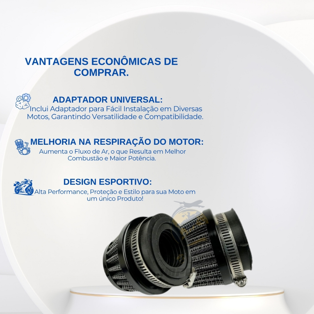 Filtro de Ar Esportivo Universal para Moto – Com Adaptador e Abraçadeira Alta performance, proteção e estilo para sua moto em um único produto! CARACTERÍSTICAS DO PRODUTO: Compatível com carburadores de 36,3mm a 49mm – Serve em diversos modelos de moto (consulte medidas). Tamanhos disponíveis: 35mm e 42mm (escolha ideal para melhor encaixe). Material resistente e de alta durabilidade – Ideal para uso prolongado. Filtro lavável e reutilizável – Fácil de limpar e manter. Acompanha adaptador + 1 abraçadeira de brinde! Cores disponíveis: Preto, Azul, Vermelho, Prata e Dourado – Personalize sua moto com estilo! BENEFÍCIOS REAIS PARA SUA MOTO: Melhora a performance: Aumenta o fluxo de ar, proporcionando mais potência e melhor desempenho do motor. Protege o motor: Filtra impurezas, poeira e sujeiras do ar, evitando danos internos. Lavável e reutilizável: Economize com manutenção! Basta lavar, secar e reutilizar. Estilo esportivo: Deixe sua moto com visual mais agressivo e moderno. O QUE VEM NA EMBALAGEM? 1x Filtro de Ar Esportivo 1x Abraçadeira Metálica 1x Adaptador para encaixe (conforme o modelo escolhido) IMPORTANTE: Verifique o tamanho do seu carburador antes da compra (35mm ou 42mm). Um filtro de ar limpo é essencial para manter o desempenho do motor. Faça a manutenção regularmente. ENVIO IMEDIATO! Postagem rápida após confirmação de pagamento! Transforme sua pilotagem com mais desempenho, proteção e estilo com o Filtro de Ar Esportivo Universal!