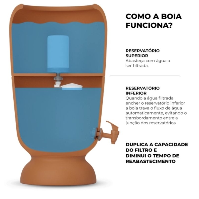Filtro de barro com capacidade de armazenar 20 Litros de água no total sendo 10 litros na parte superior e 10 litros na parte inferior; Durabilidade e qualidade água naturalmente fresca e saudável, feito à mão em argila e reduz impurezas presentes na água; Especificação do Filtro: Produto com certificação INMETRO em purificação. Capacidade: 10 litros por reservatório. Itens incluso: Produto de fácil montagem. 03 Velas (vela com porcas e arruelas de vedação). 03 Boias para duplicar a capacidade do filtro mantendo os 2 reservatórios sempre cheios. 01 Torneira. 01 Reservatório superior. 01 Reservatório inferior. 01 Tampa. Manutenção: Higienização: usar somente esponja limpa e água. Manutenção da vela: a vela deve ser substituída a cada 6 meses