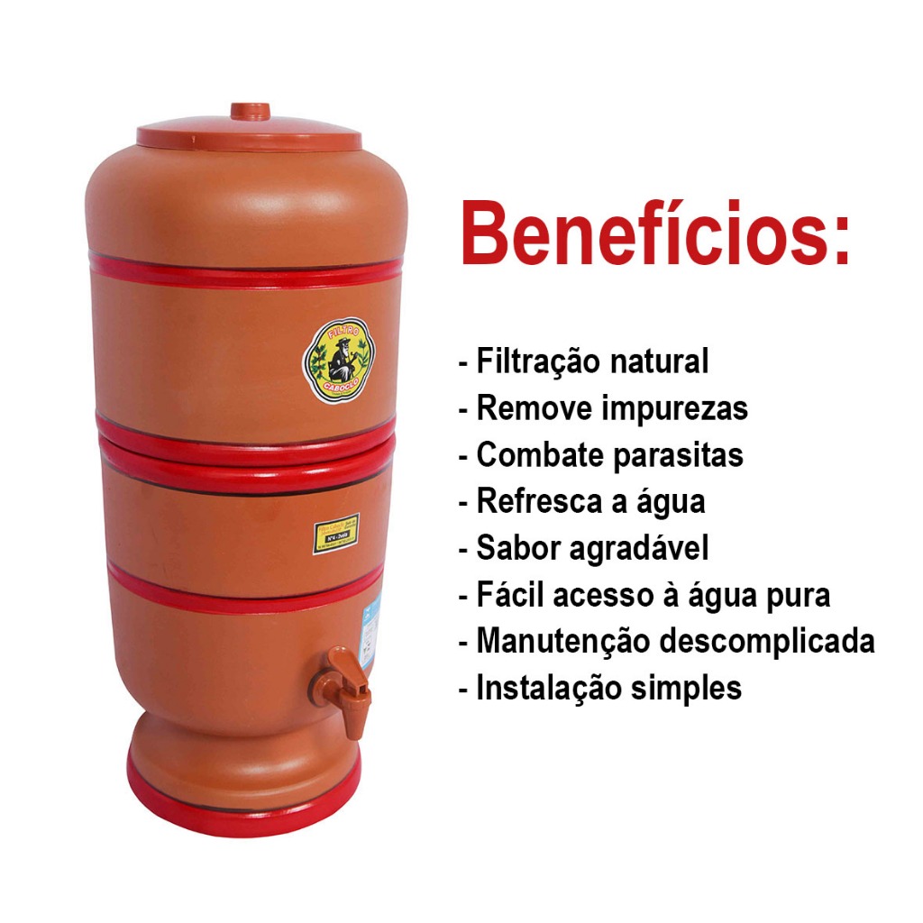 Descrição do produto ENVIAMOS COM CAIXA REFORÇADA E COM PROTEÇÃO PARA NÃO TER PROBLEMAS NO TRANSPORTE!! Filtro protegido com isopor na parte interna da caixa! Filtro de Barro 04 litros ACOMPANHA: • 1 Vela • 1 Tampa • 1 Boia • 1 Torneira • 1 Reservatório superior • 1 Reservatório inferior ATENÇÃO: RECOMENDAMOS QUE FAÇA A COMPRA DE APENAS UMA UNIDADE POR PRODUTO. POIS DEVIDO AO SEU TAMANHO E PESO, SE TORNA INVIÁVEL ENVIAR MAIS DE UMA UNIDADE NA MESMA CAIXA, ASSIM EVITAMOS POSSÍVEIS PROBLEMAS COM A ENTREGA! Garantimos rapidez no envio. O Filtro de Barro é fácil de manusear e manter, dispondo de água sempre fresca, com qualidade e total eficiência no processo de tratamento. É fabricado em argila, faz a troca de calor com o ambiente externo, levando a água a ficar até 5 graus abaixo da temperatura ambiente - mantida sempre fresca. São equipados com vela de carvão ativado que retém partículas sólidas e impurezas. CARACTERÍSTICAS : Durabilidade; Eficiência; Água naturalmente fresca e saudável a todo o momento; Fabricado em argila especial; Redução de impurezas presentes na água; MANUTENÇÃO : A primeira filtragem recomenda-se descartar, sem o consumo, uma vez que a água é utilizada para limpar o Filtro e ativar a vela. Depois da primeira filtragem, é possível começar a tomar água limpa e mais saudável. Além disso, a água pode apresentar um sabor característico do elemento filtrante cerâmico. Os Filtros de Barro apresentam no início esse sabor similar a sua matéria prima, o que é normal nos Filtros desse tipo de material. O sabor desaparece com o tempo. A recomendação é que o Filtro de Barro seja limpo com um pano úmido ou seco, ou somente uma esponja limpa e água sem utilizar qualquer tipo de produto químico, removendo apenas o acúmulo de poeira na superfície externa e úmida do equipamento. A vela do Filtro deve ser trocada a cada 6 meses de uso, tempo aproximado para filtragem de 500 litros de água. SE A VELA DEIXAR DE FILTRAR, É NECESSÁRIO SUBSTITUÍ-LA.