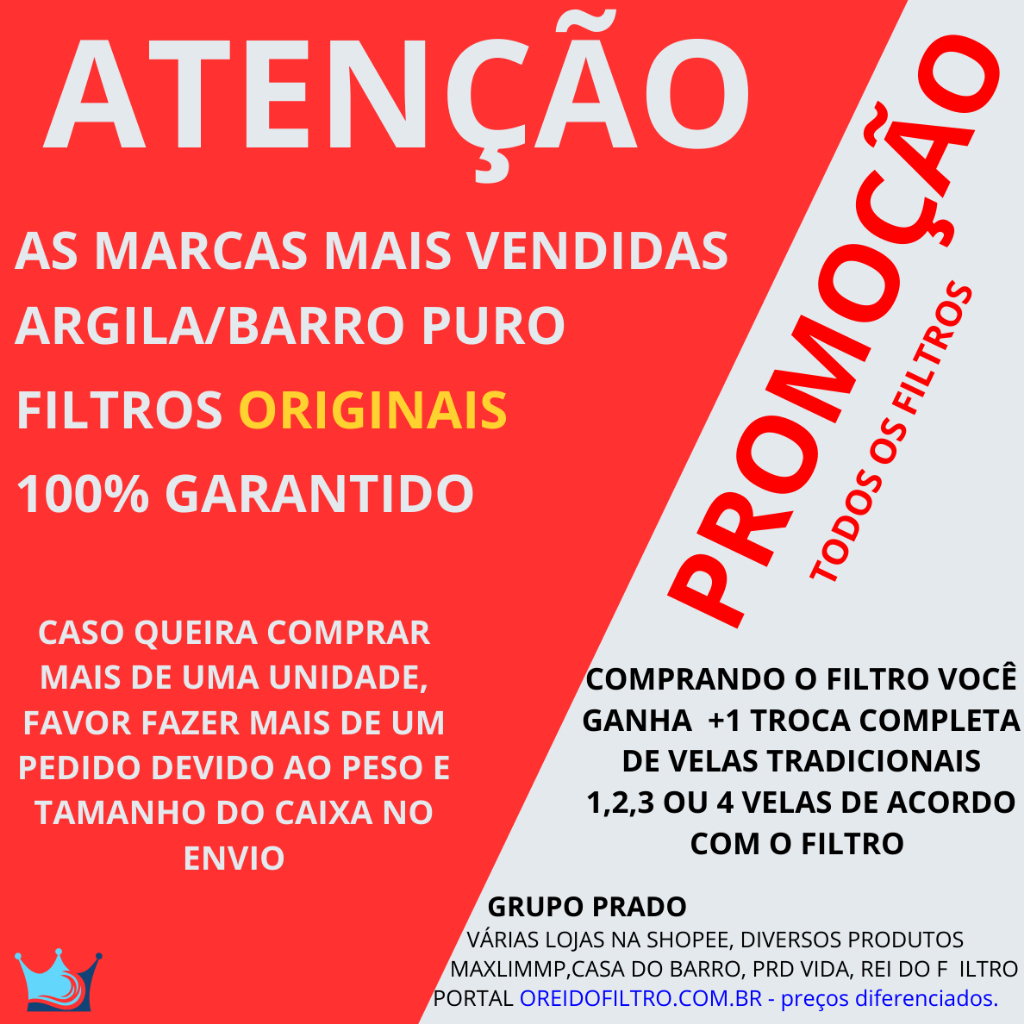 FILTRO DE 3 LITROS - PERFEITO PARA PEQUENOS ESPAÇOS - ALTA QUALIDADE DECORA O AMBIENTE E AINDA TE FORNECE ÁGUA PURA. DISTRIBUIDOR DIRETO DA FÁBRICA ✅ ****NOVIDADE**** CONSULTE PREÇOS DIFERENCIADOS NO MAIOR DISTRIBUIDOR DE FILTROS DA INTERNET EM maxshopp,com,br GRUPO O REI DO FILTRO, EMPRESA SÉRIA E COMPROMETIDA COM A QUALIDADE. CARACTERÍSTICAS E BENEFÍCIOS:: PRODUTO DE 1° QUALIDADE - PREMIUM. ( SÓ AQUI VOCÊ ENCONTRA O ORIGINAL E VERDADEIRO COM GARANTIA ) Anuncio referente Filtro SANTA MARINA /CELESTE / OASIS - CAPACIDADE TOTAL DE 3 LITROS. (1,5L superior + 1,5L inferior) EMBALAGEM REFORÇADA COM MATERIAL ANTI IMPACTO. (FUNDO, LATERAIS, TAMPA) PRODUTO COM SELO DE APROVAÇÃO DO INMETRO ********** PRODUTO FABRICADO SOB RIGOROSO PROCESSO DE QUALIDADE *********** - Durabilidade e qualidade comprovadas; - Água naturalmente fresca e saudável; - Feito à mão em argila especial e selecionada; - Reduz impurezas presentes na água; - Elimina 99% das bactérias; - Retira gosto de cloro da água tratada; - Equipado com vela tradicional, boias anti transborno e torneira marrom clic. - Filtragem por gravidade, a mais eficaz e eficiente. - Vendido com 1 troca de vela tradicional gratuita. MANUTENÇÃO: - Higienização: Usar somente esponja limpa e água. - Manutenção das velas: As velas devem ser substituídas aproximadamente a cada 6 meses. CONTEÚDO DO FILTRO SANTA MARINA/CELESTE/OASIS 3 LITROS (1,5 LITROS NA PARTE INFERIOR + 1,5 LITROS NA PARTE SUPERIOR), SEMPRE CHEIA. * 1 reservatórios de barro/cerâmica (parte superior, água não filtrada) com capacidade para 1,5 litros; * 1 Reservatório de barro/cerâmica (parte inferior, água já filtrada) com capacidade para 1,5 litros; * 1 Vela (a melhor vela e mais completa para filtros por gravidade); * 1 Boia Dosadoras, Anti Transbordo (por abaixo das velas); (opcional) * 1 torneira marrom original Clik; * 1 tampa marrom (parte superior); * Manual de instruções. *EMPRESA COM SELO ORIGINAL DO INMETRO SANTA MARINA / OASIS/CELESTE * SEM FALSIFICAÇÃO.