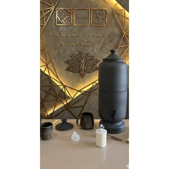 A união definitiva entre a tradição ancestral e a sofisticação contemporânea. Esse lindo filtro, mas uma peça de design funcional que redefine o conceito de purificação em casa. Com um acabamento em preto profundo e fosco, este modelo equilibra a robustez do barro com uma silhueta minimalista, tornando-se o protagonista de cozinhas modernas e espaços gourmet. Destaques da Experiência Aparência Premium: Textura acetinada em tom carvão que oculta marcas de uso e exala elegância. Frescor Natural: A porosidade da argila selecionada mantém a água até 5°C abaixo da temperatura ambiente, garantindo um gole sempre revigorante. Capacidade Generosa: Reservatório total de 8 litros (4 CADA PARTE), ideal para famílias que não abrem mão de pureza e volume. Tampa em Barro : Um detalhe artesanal que preserva a identidade clássica do filtro de barro, criando um contraste visual orgânico e sofisticado. Especificações Técnicas CaracterísticaDetalheMaterialCerâmica de alta densidade com acabamento Matte BlackCapacidade8 LitrosSistemaFiltragem por gravidade (retenção de partículas e decloração)ComponentesVela de tripla ação, boia reguladora e torneira premiumDesignTampa em barro natural com ajuste hermético Por que escolher Nosso Filtro? Diferente dos filtros plásticos ou metálicos, respeita o tempo da água. Equipado com um sistema completo de filtragem, ele remove impurezas e reduz o cloro, entregando uma água com pH equilibrado e sem sabores residuais. É o retorno ao essencial, com a estética do luxo.