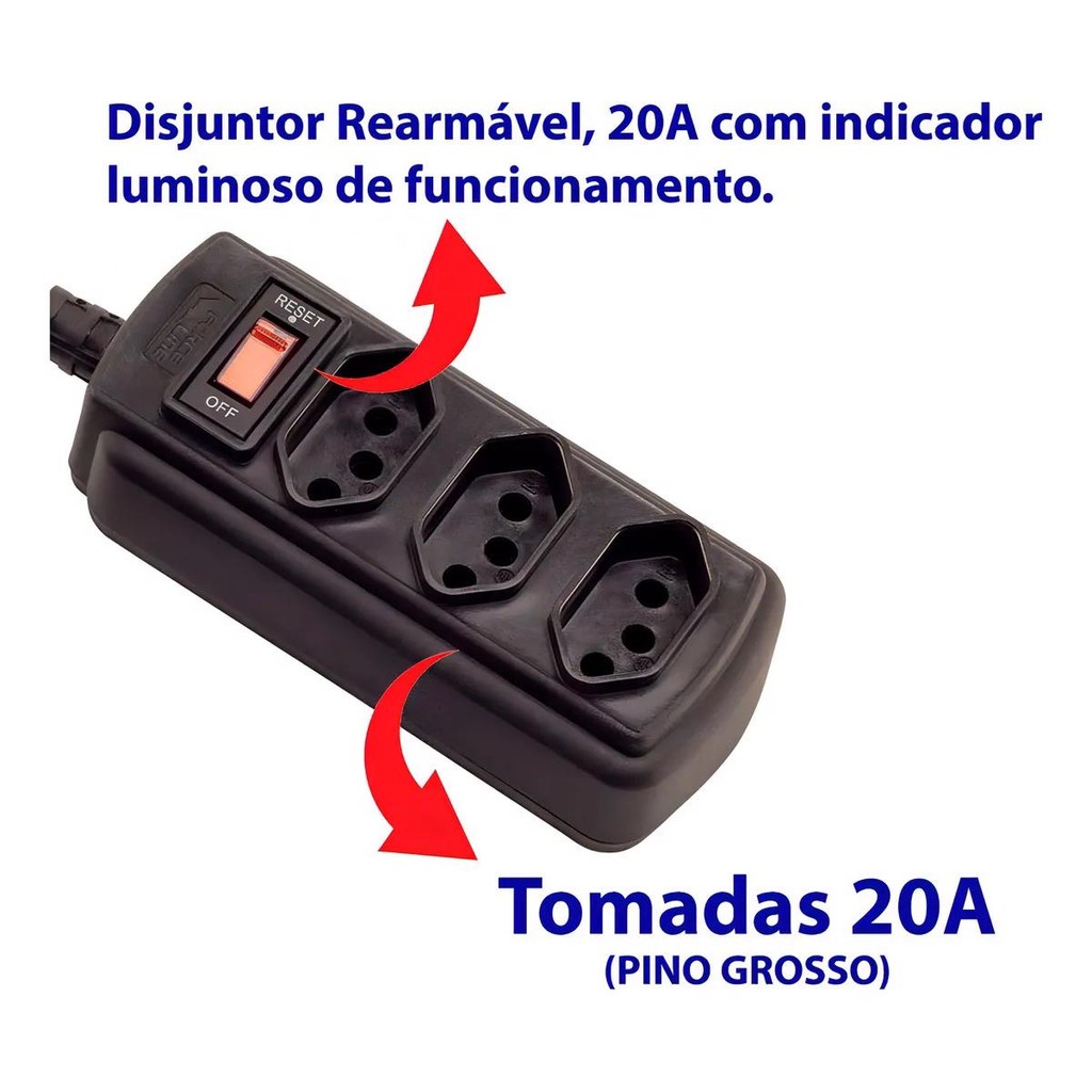 Filtro de Linha 20A 3 Tomadas Preto Cabo 1,50m Force Line Extensão Elétrica Energia Várias Tomadas