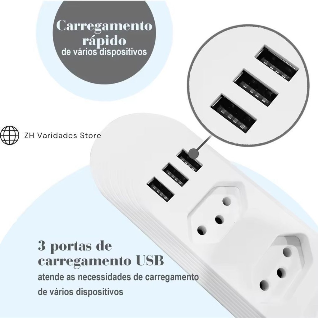 Filtro De Linha Extensão Régua 3 Tomadas 3 Usb Bivolt 2 metros Fio Branco