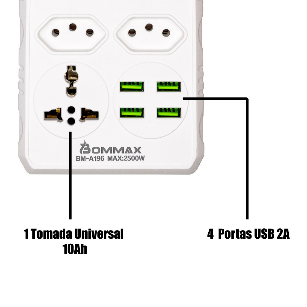 Filtro de Linha Extensível de 2Metros 6 Tomadas + 4 PortasUSB +1 Tomada Universal Segurança Certificada e Conexões
