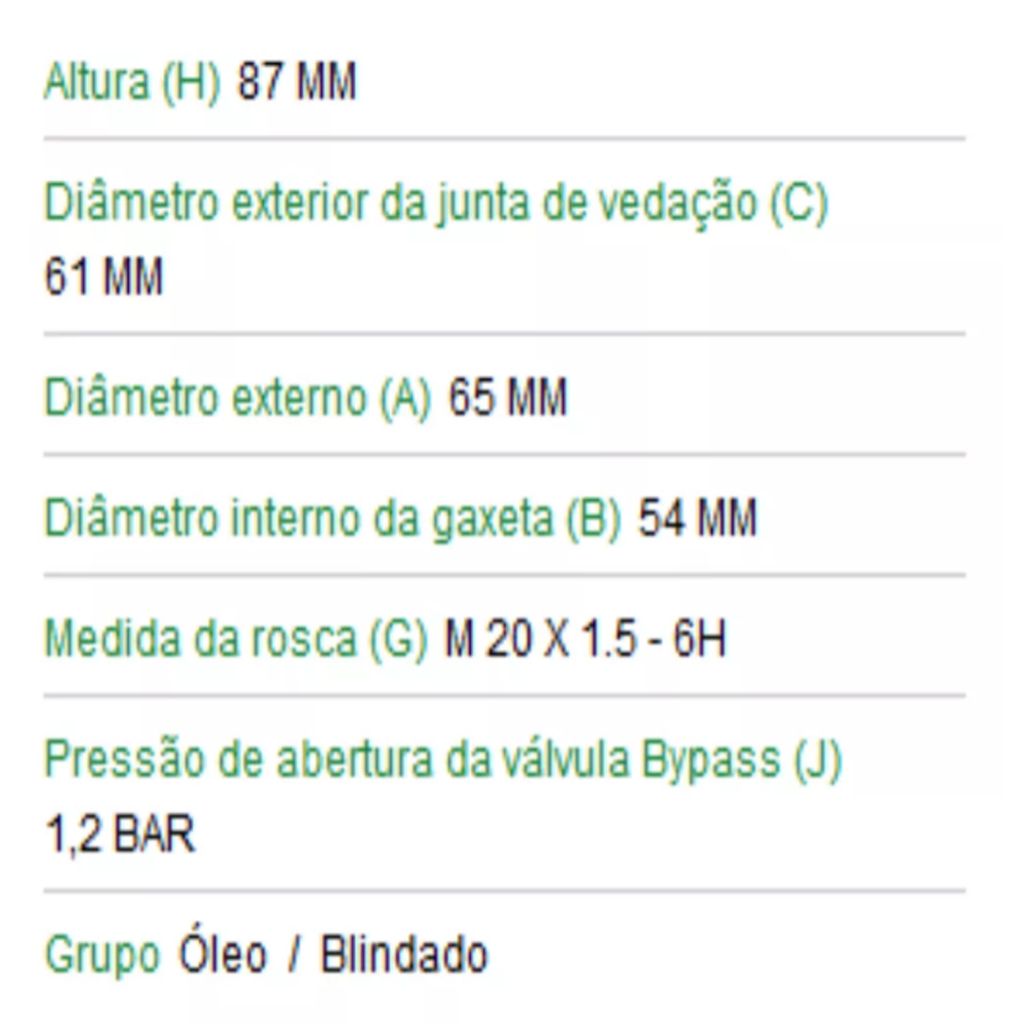 Filtro de Óleo Fiat Palio Uno Fiorino Doblo Mobi Strada Fiorino Idea Mobi Honda City Civic CRV Fit Mann W6100 *** Obs.: Não serve para motores 3 cilindros *** Marca: Mann Demais aplicações: FIAT Cinquecento (Fiat 500) 1.4 16V (jul/07 - jul/11) MULTIAIR - (Sport / Lounge) Gasolina FIAT Cinquecento (Fiat 500) 1.4 8V (ago/11 - atual) EVO (Cult Dualogic / Cult) Flex FIAT Doblo 1.3 16V (2001 - 2006) Cargo / EX RST Gasolina FIAT Doblo 1.4 8V (nov/09 - 2015) Attractive / ELX Flex FIAT Fiorino 1.3 8V (2002 - 2006) Furgão Fire Gasolina FIAT Fiorino 1.3 8V (2007 - out/13) Fire Flex Flex FIAT Fiorino 1.4 8V EVO (nov/13 - atual) Furgão Fire Flex FIAT Fiorino 1.4 8V EVO (2006 - 2012) Furgão Fire Flex FIAT Grand Siena 1.0 8V - 75 cv (2017 - atual) (EVO / ATTRACTIVE) Flex FIAT Grand Siena 1.4 8V Fire (2012 - 2014) Attractive Flex FIAT Grand Siena 1.4 8V (2015 - atual) Tetrafuel FIAT Idea 1.4 8V (2005 - 2012) Attractive/ELX FIRE Flex FIAT Mobi 1.0 4cil (2016 - atual) Fire - Easy / Like / Way Flex FIAT Palio Weekend 1.0 16V (2000 - 2003) FIRE Gasolina FIAT Palio Weekend 1.3 16V (2000 - 2005) FIRE Gasolina/Flex FIAT Palio Weekend 1.3 8V (2003 - 2004) FIRE Gasolina FIAT Palio Weekend 1.4 8V (2005 - atual) Attractive/ELX FIRE Flex FIAT Palio 1.0 16V (2001 - 2003) ELX / EX FIRE Gasolina/Flex FIAT Palio 1.0 8V (2003 - atual) FIRE Flex FIAT Palio 1.0 (2011 - atual) Attractive Flex FIAT Palio 1.3 16V (2000 - 2003) FIRE Gasolina FIAT Palio 1.3 8V (2002 - 2005) FIRE Flex FIAT Palio 1.4 8V (2005 - 2012) FIRE Flex FIAT Palio 1.4 (2011 - atual) Attractive Flex FIAT Punto 1.4 8V (jul/07 - dez/12) FIRE (ELX) Flex FIAT Punto 1.4 8V (jul/07 - dez/12) FIRE (ELX) Flex FIAT Siena 1.0 16V (2000 - 2003) FIRE Gasolina FIAT Siena 1.0 8V (2000 - 2016) Attractive/FIRE Gasolina/Flex FIAT Siena 1.3 16V (2000 - 2005) FIRE Gasolina/Flex FIAT Siena 1.4 8V (2005 - 2012) FIRE / TETRAFUEL Flex FIAT Siena 1.6 16V (2001 - 2004) FIRE Gasolina FIAT Strada 1.3 8V (2002 - 2005) FIRE Gasolina FIAT Strada 1.4 8V (2005 - atual) (Fire - Working) Flex FIAT Strada 1.4 8V (2020 - atual) (Hard Working / Freedom / Working) Flex FIAT Uno 1.0 8V 75cv (2017 - atual) Attractive Flex FIAT Uno 1.0 8V (2005 - 2015) FIRE - Economy Flex FIAT Uno 1.0 8V (2000 - 2006) FIRE Álcool/Gasolina FIAT Uno 1.0 EVO 8V Fire (mai/10 - 2016) VIVACE Flex FIAT Uno 1.4 EVO 8V Fire (mai/10 - 2016) VIVACE Flex HONDA Accord 2.0 16V (jan/06 - 2009) Gasolina HONDA Accord 3.5 V6 (2008 - 2015) Gasolina HONDA City 1.5 16V 126cv (2022 - atual) (EX / CVT / EXL CVT / Touring) - automática / mecânica Flex HONDA City 1.5 16V (2014 - atual) (EXL / LX / Sport) - Automático / Mecânico Flex HONDA City 1.5 16V (2009 - 2013) i-VTEC Flex HONDA Civic (jan/93 - dez/95) CRX / Targa VTI Gasolina HONDA Civic (jan/92 - dez/95) Hatch DX Gasolina HONDA Civic (1991 - 1995) Hatch LSi Gasolina HONDA Civic (1992 - 1996) Hatch LX / Automático Gasolina HONDA Civic (1993 - 1995) Hatch Si Gasolina HONDA Civic (1992 - 1998) Hatch VTI Gasolina HONDA Civic 1.5 Turbo (2016 - atual) Touring Flex HONDA Civic 1.5 (1992 - 1997) LX Gasolina HONDA Civic 1.6 16V (1991 - dez/98) Coupe EX / EXS Gasolina HONDA Civic 1.6 16V (1997 - dez/00) EX / Aut. Gasolina HONDA Civic 1.6 16V (1997 - dez/00) EX/Automático Gasolina HONDA Civic 1.6 16V (1997 - dez/00) Sedã LX / Aut. Gasolina HONDA Civic 1.6 16V (1997 - dez/00) Sedã LX / Automático Gasolina HONDA Civic 1.6 8V (1992 - dez/97) EX/EXS Gasolina HONDA Civic 1.6i (1996 - 2000) LX / EX / VTi Gasolina HONDA Civic 1.7 16V (2001 - 2005) EX / ELX / LXL Gasolina HONDA Civic 1.7 16V (jan/06 - dez/06) EX / Automático Gasolina HONDA Civic 1.7 16V (jan/06 - dez/06) EX / ELX / LXL / AUT. Gasolina HONDA Civic 1.7 16V (2001 - dez/03) EX Gasolina HONDA Civic 1.7 16V (2001 - dez/05) EX/ Automático Gasolina HONDA Civic 1.7 16V (jan/06 - dez/06) Sedã LX / LXL / Automático Gasolina HONDA Civic 1.7 16V (2001 - dez/05) Sedã LX / LXL / Automático Gasolina HONDA Civic 1.7 16V (2001 - dez/05) Sedã LXB Gasolina HONDA Civic 1.7 16V (jan/06 - dez/06) Sedã/ LXB Gasolina HONDA Civic 1.7 16V (jan/05 - dez/05) Sedã/ LXL / Automático Gasolina HONDA Civic 1.7 16V (jan/06 - dez/06) Sedã/ LXL / Automático Gasolina HONDA Civic 1.8 16v i-VTEC (fev/12 - atual) (EXS / LXS / LXL) - Automático / Mecânico Flex HONDA Civic 1.8 16V (jan/07 - dez/11) (EXS / LXS / LXL) - Automático / Mecânico Flex HONDA Civic 1.8 (2006 - 2007) (LXL / LXS / EXS) Gasolina HONDA Civic 2.0 155 cv (2013 - 2015) (EXS / LXR) - Automático / Mecânico Flex HONDA Civic 2.0 16V (2016 - atual) i-vtec (EXL/EX/Sport) Flex HONDA Civic 2.0 L 16V DOHC L4 (2023 - atual) Hybrid Gasolina HONDA Civic 2.0 (2007 - 2011) Si Gasolina HONDA CRV 1.5 16V TURBO (2020 - atual) Gasolina HONDA CRV 2.0 16V 150 cv (2008 - 2012) (LX / LXS) - Automático / Mecânico Flex HONDA CRV 2.0 16V 150 cv (2012 - atual) (LX / LXS) - Automático / Mecânico Flex HONDA CRV 2.0 16V (2005 - 2006) Aut. Gasolina HONDA CRV 2.0 16V (2007 - 2011) Aut. Gasolina HONDA CRV 2.0 16V (2000 - dez/01) Mec. / Aut. Gasolina