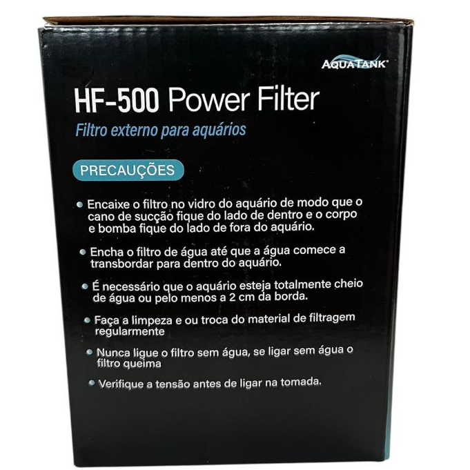 NOVO FILTRO EXTERNO HANG ON HF 500 AQUATANK !! * Voltagem: 110v ou 220v ( escolha sua voltagem ) * Bonito, prático e funcional com baixo custo * Medidas aproximadas 16x12x11cm * Filtro externo (tipo Hang on filter) * Extremamente silencioso, pode ser usado em aquários marinhos ou de água doce * Especificação: vazão máxima de 500 L/H e potência de 5 watts * Precauções: Conecte somente em rede elétrica conforme especificado no aparelho ou na embalagem * Não utilize fluídos inflamáveis ou água acima de 35ºC * Manutenção: A manutenção periódica a cada 2 meses garantirá um funcionamento regular e vida longa ao filtro. * Antes de iniciar a limpeza do filtro, desligue-o da rede elétrica e em seguida retire a água de dentro