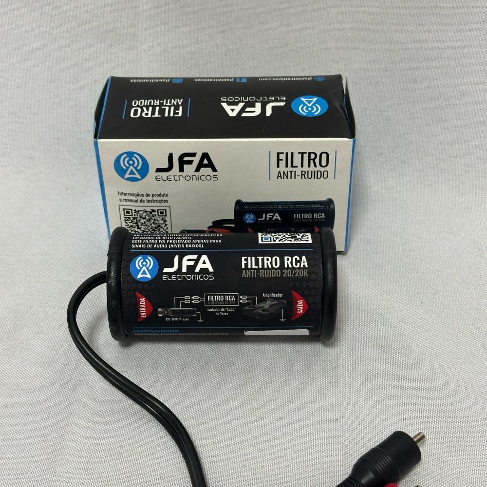 O Filtro RCA Antirruído JFA isola os fios terra do player e do amplificador, eliminando os ruídos gerados por “loop” de terra e evitando a queima de trilhas internas no player. Além disso, o equipamento dispõe de: 2 entradas RCA; 2 saídas RCA; Filtro eletromagnético. Informações técnicas Entrada de nível baixo (RCA) 2 (L e R) Saída de nível baixo (RCA) 2 (L e R) Filtros eletromagnéticos supressores de ruído = Sim