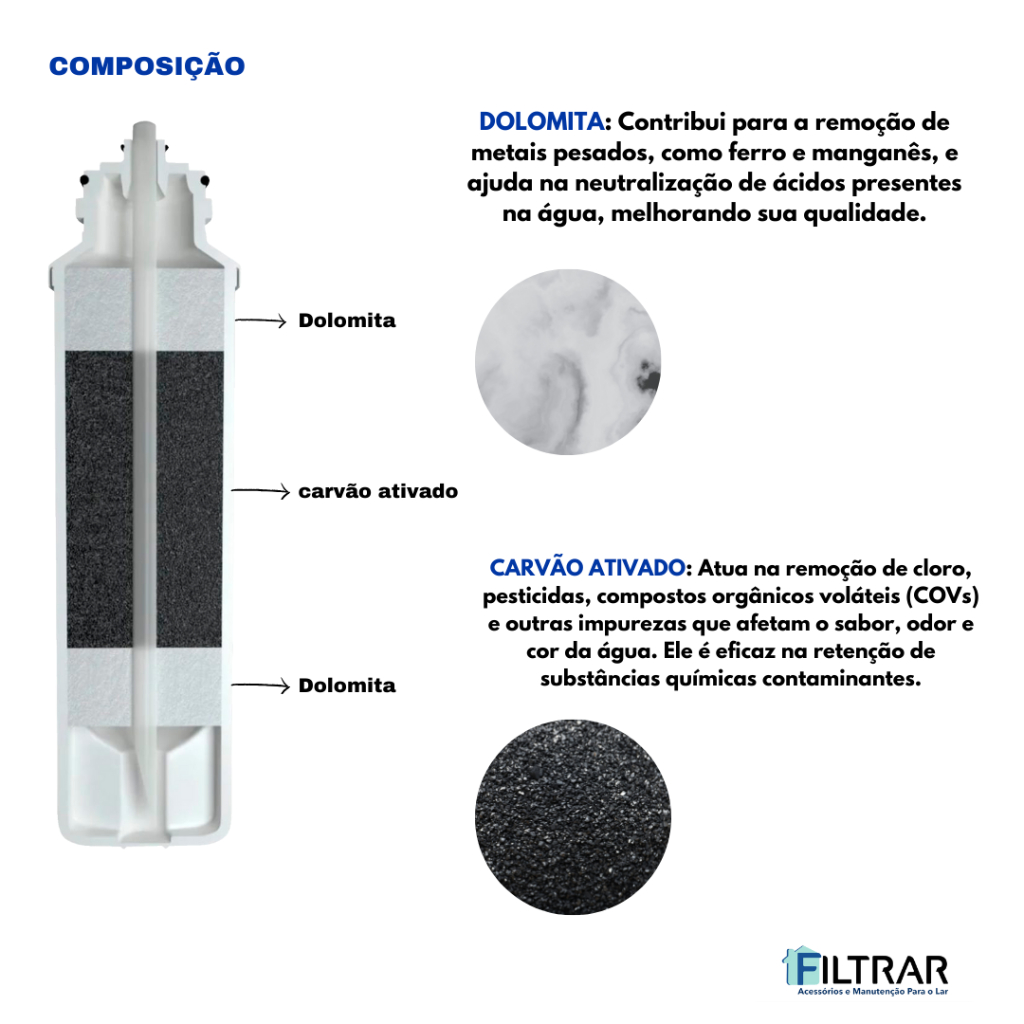 Filtro Refil Midea Purificador Sensia Liva Kfpna Características: - WFS 026 FRESCH FLOW Marca: - WFS, COMPÁTIVEL COM MIDEA Compatível com os modelos: - PNATBNB, PNATBSB, PNATPNB, PNATPSB e PNATXSB - Compatível KFPNA Compatível para linha de Purificadores de Água MIDEA com água gelada e natural. - REFIL 2 EM 1 ( Elemento Filtrante ) Desenvolvido para uso com água potável, ou seja, tratada por concessionária de fornecimento de água. Seu filtro "2 em 1" tem por finalidade reter impurezas nela contida, assim como, reduzir cloro, odores e sabores estranhos à água. Filtro possui em média uma vida útil de 4.000 litros, podendo ser reduzida dependendo da qualidade (impurezas, teor de cloro, etc...) da água utilizada diariamente. Caso a vazão de água diminua sensivelmente, ou se observem alterações de gosto ou odor na água, isto indica a saturação do elemento filtrante e/ou do carvão ativado, sendo necessário em qualquer dos casos a troca do filtro entre 6 e 9 meses, por questão de segurança, o seu filtro deverá ser substituído mesmo que não apresente nenhum tipo de alteração acima descrito. - 1a.Etapa - Pré-Filtro: Cartucho em polipropileno atóxico produzido pelo sistema Melt blown, que consiste na sobreposição de microfibras tramadas. Retém impurezas (superiores a 5 micra) na sua superfície e ao longo de sua espessura, conferindo-lhe maior durabilidade. - 2a.Etapa - Filtro: Carvão ativado que pelo processo de absorção reduz cloro, odores e sabores estranhos à água. Este carvão é impregnado com prata coloidal cuja ação bacteriostática inibe a proliferação de microorganismos em seu interior. IMPORTANTE: Use o elemento filtrante de qualidade e compatível para garantir o perfeito funcionamento e qualidade do produto. BENEFÍCIOS: - Elimina odores - Elimina sabores desagradáveis - Retém partículas (barro, areia, ferrugem e sedimentos) - Reduz cloro - Bacteriostático (controla a proliferação de bactérias) - 3 etapas de filtragem - Produto a ser utilizado com água potável, de acordo com a Portaria MS 2914 - Teste de estanqueidade realizado eletrônicamente. Os ensaios foram realizados de acordo com a NBR 14908:2004 CARACTERÍSTICAS TÉCNICAS: - Vida útil: 3000 litros ou 6 MESES - Pressão de Operação: 25 a 700 kPa - Vazão: 50/60 litros/hora - Ensaios de Desempenho - Retenção de Partículas: Classe III - Retenção da Redução de Cloro Livre: Classe I - Eficiência antimicrobiana: Se aplica TROQUE A CADA 6 MESES - Após esse período os microporos do filtro ficam preenchidos pelas impurezas e não realizam mais a purificação adequada. Garantia do Produto 30 dias Garantia de Originalidade WFS com compatibilidade aos Purificadores MIDEA e Garantia contra defeitos de Fabricação, o filtro deve ser usado no máximo 06 meses expirado o mesmo deve ser trocado para garantir uma boa Qualidade da Água. Pedidos feitos até as 14 horas serão postados no mesmo dia.
