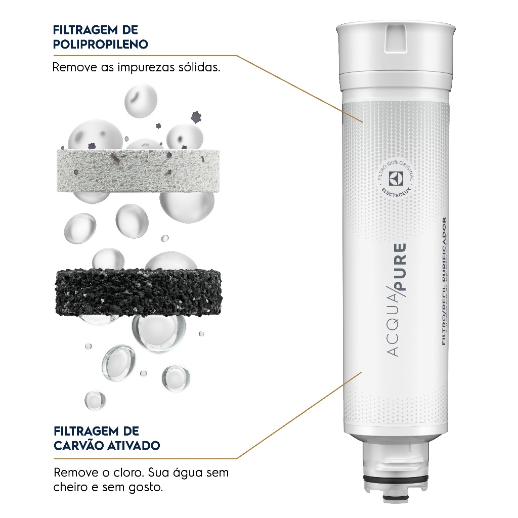 Filtro/Refil Original de Água Purificador Electrolux PE11/41 Água pura, segura e com o sabor natural que você merece O Filtro/Refil Original Electrolux Acqua Pure é um consumível essencial para manter a qualidade da água e o perfeito funcionamento do seu purificador. Desenvolvido com materiais de alta eficiência e tecnologia de ponta, ele remove partículas sólidas, odores e o gosto de cloro, garantindo uma água limpa, fresca e saudável todos os dias. Tecnologia Acqua Pure – Dupla Etapa de Filtragem Avançada Filtragem de Polipropileno Meltblown A barreira de polipropileno permite maior capacidade de retenção de contaminantes, reduzindo micropartículas entre 5 e 15 micrômetros — invisíveis a olho nu — e assegurando uma água cristalina e livre de impurezas. Filtragem de Carvão Ativado com Íons de Prata O carvão ativado reduz o excesso de cloro livre, eliminando odores e sabores desagradáveis, além de atuar no controle microbiológico, garantindo água segura para o consumo. Desempenho Testado e Aprovado Retém micropartículas de 5 a 15 µm Reduz, no mínimo, 75% do cloro livre presente na água Controle microbiológico, mantendo a água livre de microrganismos Testado e aprovado de acordo com a norma ABNT NBR 16098:2012 – Classificação C para particulado Principais Benefícios Alta eficiência na retenção de partículas e controle microbiológico. Redução mínima de 75% de cloro livre, graças à combinação de carvão ativado e polipropileno meltblown. Vida útil de até 3.000 litros ou 6 meses (o que ocorrer primeiro). Materiais recicláveis e ecologicamente corretos. Mantém o desempenho e a durabilidade do seu purificador Electrolux. Compatibilidade Compatível com os seguintes modelos de purificadores Electrolux: PE11B, PE11X, PC41B, PC41X, PH41B e PH41X. Atenção: Refis compatíveis ou genéricos não são testados nem aprovados pela Electrolux. Seu uso pode comprometer a qualidade da água, a vida útil e o desempenho do purificador. Utilize apenas o refil original para garantir segurança e eficiência. (Só use produtos originais e com garantia) Recomendações de Uso Instale o refil conforme o manual do purificador. Substitua a cada 3.000 litros filtrados ou 6 meses de uso. Utilize sempre peças originais Electrolux para garantir água pura de verdade. Meio Ambiente O refil Electrolux é produzido com materiais orgânicos e recicláveis. A embalagem também é reciclável — separe-a corretamente para coleta seletiva e destinação adequada, contribuindo para um consumo mais sustentável. Compra Recorrente Electrolux Facilidade: receba o refil em casa, no tempo certo, sem preocupações. Liberdade: altere a frequência, adicione produtos ou cancele quando quiser. Ficha Técnica Marca: Electrolux Modelo: Refil Original Acqua Pure PE11/41 Tecnologia de Filtragem: Carvão ativado com íons de prata + Polipropileno Meltblown Partículas Retidas: 5 a 15 µm Redução de Cloro Livre: = 75% Capacidade de Filtragem: Até 3.000 L Vida Útil: 6 meses Certificação: ABNT NBR 16098:2012 / Inmetro Cor: Branco Dimensões: 27 cm (A) x 6,9 cm (L) x 6,9 cm (P) Conteúdo da Embalagem -1 Filtro/Refil Original Electrolux Acqua Pure; -1 Manual de instruções.