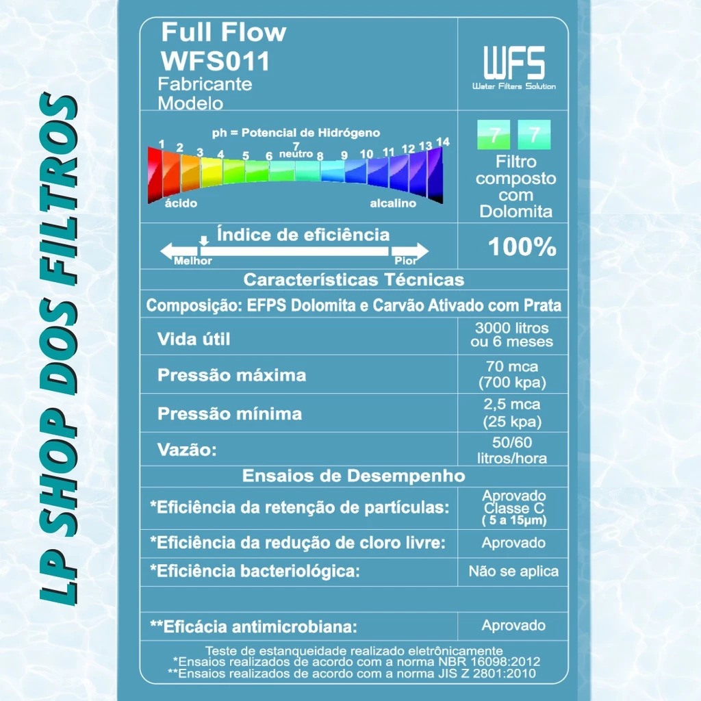 Filtro Refil FULL FLOW - WFS 011 Compatível com os Purificadores de Água Esmaltec Acqua7 Fazer a troca do filtro é realmente muito simples e leva poucos minutos. Junto dos filtros nós enviamos nosso manual exclusivo com todas as orientações passo a passo de como fazer a troca. É super simples. O filtro deve ser trocado a cada 6 meses, ou antes, caso estime que seja consumido 3000 litros antes do prazo ou observe redução do fluxo de água. O filtro remove o cloro da água, elimina sabores, retém partículas de sujeira, barro, ferrugem, eleva o Ph, além de eliminar 96% de bactérias e micróbios. INFORMAÇÕES TÉCNICAS: Fabricante/Marca do refil: WFS Vida útil : 3.000 litros ou 6 meses Pressão máxima 70mca (700kpa) Pressão Mínima 2,5 mca (25kpa) Vazão 50/60 litros hora ENSAIOS DE DESEMPENHO: Eficiência na retenção de partícula: classe C Eficiência na retenção de cloro livre: se aplica Eficácia Antimicrobiana: Aprovado! * Teste de estanqueidade realizado eletronicamente. Enviamos para Todo Brasil!! Envio: - Envio é feito em até 24h. Dúvidas: - Para qualquer dúvida relacionada ao uso do produto use o campo de perguntas abaixo: