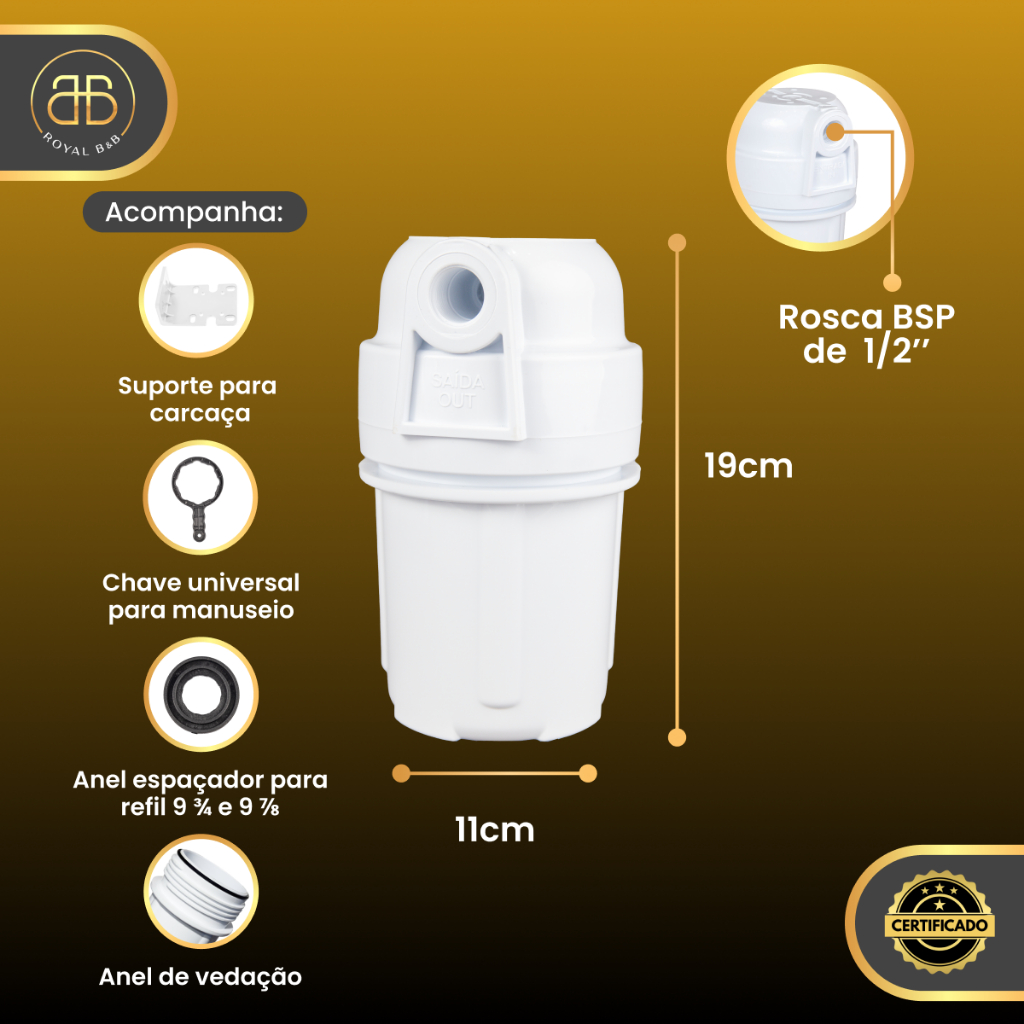 BM Commerce é a sua melhor opção: atendimento personalizado, rapidez na entrega e facilidade de pagamento para oferecer sempre o melhor para todos os clientes. Com mais de 38 anos de experiência no segmento buscamos identificar todas as necessidades dos clientes e temos como compromisso atendê-los de maneira rápida e eficaz. Kit contém: - 1 Carcaça 5" (cor branco) - 1 Refil Carvão Ativado 5 Micras ( retém odores e cloro ) - 1 Chave para Manutenção Características:- Filtro de alta qualidade.- Fácil instalação. Instale você mesmo.- Mantém a água limpa, muito mais qualidade. Diferenciais:- Produzido em material Resistente- Rosca de ½- Brilho nos cabelos e pele saudável- Evita crises alérgicas e respiratórias pela inalação do cloro; - Melhora o aspecto do cabelo, que fica mais macio e com brilho;- Reduz o cloro livre presente na água pré-tratada; - Conexões ( Roscas ): ½ Filtro corpo em sangel e cabeça em polipropileno, pode ser instalado em qualquer posição para uso doméstico ou comercial. Tem baixo custo de manutenção, você mesmo pode trocá-lo com facilidade. Muito utilizado no chuveiro, pia. Pode ser instalado no ponto de uso do filtro, direto na torneira, embaixo da pia, chuveiro, máquina de lavar roupa e louça ou qualquer lugar que necessite água filtrada. Acompanha chave e suporte . Pressão máxima: 56 psi. Temperatura máxima: 50ºC . Conexão: 1/2 Vazão: até 300 l/h. Altura 5”