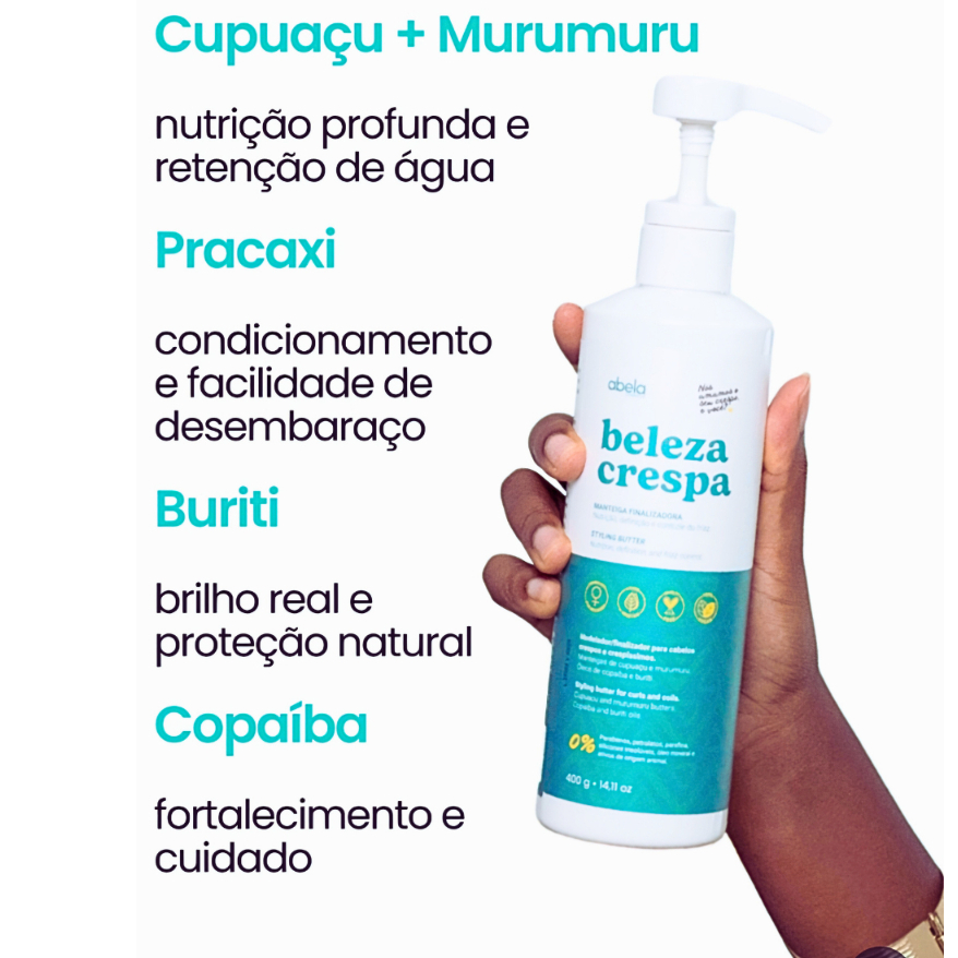 FINALIZADOR E MODELADOR ABELA BELEZA CRESPA 400G - O Finalizador Beleza Crespa é um tratamento finalizador potente, desenvolvido especialmente para atender às necessidades das curvaturas 4A, 4B e 4C. - Sua fórmula amanteigada nutre profundamente, reduz o encolhimento excessivo e entrega definição com leveza e brilho. Informação Comum do Produto: Vegano Sem Silicones Insolúveis Sem Petrolatos Sem Óleo Mineral Sem Parafina Sem Parabeno Sem Corantes Dermatologicamente Testado Para Quem: Cabelos crespos que precisam de nutrição intensa, definição duradoura e controle do frizz. Indicado para curvaturas 4A, 4B e 4C. O que é: Finalizador com alto poder nutritivo, pensado para uso diário ou sempre que seus fios precisarem de definição, tratamento e proteção. O que faz: Sua fórmula une a ação emoliente e regeneradora de manteigas e óleos amazônicos ao toque leve de ativos condicionantes. Nutre profundamente, define sem enrijecer, protege os fios do ressecamento e cria uma película protetora que retém hidratação. PRINCIPAIS ATIVOS: ✨ Manteiga de Cupuaçu: hidratação duradoura e emoliência. ✨ Manteiga de Murumuru: ação reparadora e protetora contra o ressecamento. ✨ Óleo de Pracaxi: alto poder condicionante e aumento da penteabilidade. ✨ Óleo de Buriti: brilho real, regeneração e proteção solar natural. ✨ Óleo de Copaíba: ação fortalecedora e anti-inflamatória no couro cabeludo. COMO USAR: Com os cabelos limpos e úmidos, aplique uma quantidade generosa do finalizador nos fios, mecha por mecha. Finalize como preferir: com fitagem, twist ou modelagem com as mãos. Pode ser utilizado sozinho ou combinado com outros finalizadores. Não é necessário enxaguar
