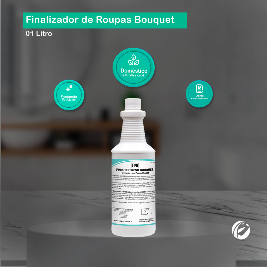 Finalizador de Roupas Finisherfresh Bouquet 1L Spartan Facilitador para passar roupas e tecidos de fibras naturais e sintéticas presentes em toalhas, lençóis, edredons, cobertores, cortinas, entre outros, eliminando a aspereza e otimizando o efeito de passadoria, deixando os tecidos macios e perfumados por longos períodos. É indicado para roupas domésticas e profissionais. Sua fragrância resiste a altas temperaturas. Modo de uso: - Uso puro pulverizando sobre o tecido, ou dentro do saco plástico de embalagem. - Caso queira uma menor intensidade do perfume na roupa, diluir o produto até 1:10 em água. PH: 6,0 Diluição: até 1:10 Fragrância: Bouquet (Floral) Embalagem: 01 frasco de 1L