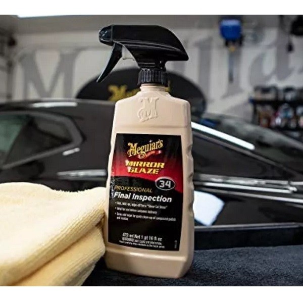 Remove os contaminantes frescos e mantém o brilho de seu veículo como em um show room Ideal para automóveis em exposição, veículos para venda e antes da entrega ao cliente Usada para limpar superfícies exteriores de veículos e ajudar na avaliação de defeitos Excelente como lubrificante nas operações de Clay para um acabamento o mais limpo possível Limpa as impressões digitais, sujeiras leves e pó A Inspeção Final Meguiar´s Mirror Glaze M34 é um produto de limpeza que remove os contaminantes frescos e mantém o brilho de seu veículo como em um show room. É usada para avaliar reparações de pintura em oficinas de carroçaria, procurar defeitos na superfície ou utilizar como limpeza final antes da entrega ao cliente. Também pode ser usada para uma limpeza rápida de poeiras, impressões digitais, contaminantes, arranhões finos e outras sujeiras. A Inspeção Final Meguiar´ Mirror Glaze M34 não só revela a beleza do veículo, como também evita que o pó se acumule. Sua fórmula fácil de usar produz aquele brilho encerado nos carros. É recomendada para veículos em exposição em feiras de automóveis, carros que estão à venda, automóveis antigos ou de coleção ou para qualquer carro apreciado por seu proprietário. Muito usada em concessionárias, a Inspeção Final Meguiar M34 é recomendada para qualquer pessoa que venda um automóvel para ajudar a aumentar o seu valor. Sua fórmula limpa e brilhante é perfeita para grandes painéis planos, como capôs, portas e para-lamas, assim como em superfícies curvas onde polimentos, ceras e poeira podem se acumular. A Inspeção Final Meguiar´s Mirror Glaze M34 é segura para uso em vernizes e revestimentos de base para tintas automotivas. Ela ajuda a melhorar a aparência das pinturas, enriquecendo a profundidade da cor. A Inspeção Final Meguiar´s Mirror Glaze M34 remove de fato o pó e as sujidades, e não apenas os move de um lado para o outro. Sua fórmula de alta lubricidade prende e encapsula as partículas e depois levanta-as quando são limpas com um pano sem pelos. O nosso produto também remove o excesso de cera ou selante que podem estar presentes no veículo. A Inspeção Final Meguiar´s Mirror Glaze M34 também é recomendada ao avaliar reparações de tinta ou defeitos de superfície. Ela remove a película, o pó ou as manchas que podem obscurecer as reparações de tinta inferiores ou defeitos superficiais, tornando as inspeções mais fáceis e precisas. A Inspeção Final Meguiar´s Mirror Glaze M34 é segura para oficinas, ou seja, ela pode ser usada em superfícies que estão sendo preparadas para a aplicação de tinta fresca e para ser pulverizada em tintas frescas antes do tempo típico de cura (de 60 a 90 dias) ter terminado. Sua fórmula também atua bem como um lubrificante nas operações de Clay, um processo que pode remover contaminantes de tinta resistentes. O Clay exige o uso de um lubrificante para proteger a superfície do veículo de riscos, uma vez que a Clay Bar é suavemente esfregada sobre o carro. Aplicações sugeridas: Exterior do veículo