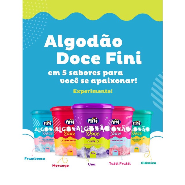 | Fini Algodão Doce Pote 35g Diversos Sabores este produto | R$ 19,99 | — | 5.0/5 | 31 |