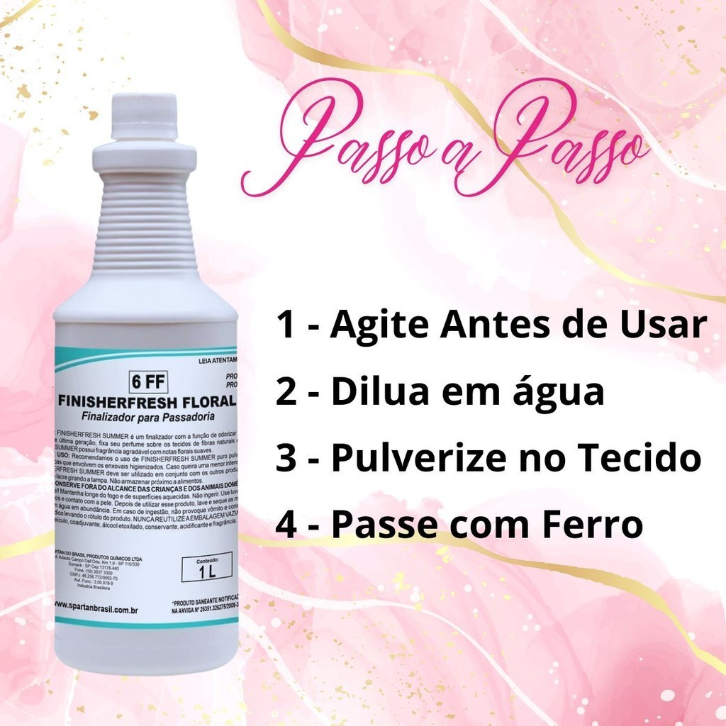 Finisher Fresh FLORAL é um facilitador para passar roupas e tecidos, formulado com matérias-primas de última geração, que permite grande fixação de perfume sobre os tecidos de fibras naturais e sintéticas, deixando a roupa perfumada por muito mais tempo. O produto possui fragrância resistente a alta temperatura, não obtendo perda de desempenho, mesmo quando utilizado em alta temperatura da roupa. specificações técnicas Aparência: Líquido transparente a líquido turvo - Cor: Amarelado - Odor: Floral - pH: 5,0 - 7,0 - Composição: Água, coadjuvante, tensoativo não iônico, conservante e fragrância. Instruções de Uso 1. Agite antes de usar. 2. Dilua o FINISHERFRESH FLORAL na proporção de 1:10 (100 mL do produto para 1 L de água) em um frasco pulverizador. 3. Pulverize o produto em tecido limpo e a uma distância mínima de 15 cm (pulverize em forma de névoa). 4.Inicie a passadoria com ferro ou calandra. Obs:Antes de utilizar o produto, realize teste em uma área não aparente para certificar-se de que não mancha. Aplicação - Finalizador para passadoria. Sua fragrância resiste a alta temperatura, deixando a roupa perfumada por dias. Diluição - até 1:10