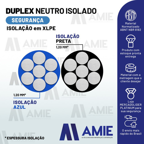 CABO DE ALUMINIO 0,6/1KV DUPLEX 1x16+16mm Neutro Isolado Azul Fase Isolada - Diâmetro do fio de alumínio: 1,70 mm - Quantidade de fios de alumínio: 7 fios - Espessura da isolação: 1,20 mm - Diâmetro condutor de alumínio: 4,75 mm - Diâmetro condutor isolado: 7,15 mm - Resistencia elétrica em C.C a 20°C: 2,8257 Neutro com isolação - Diâmetro do fio de alumínio: 1,70 mm - Quantidade de fios de alumínio: 7 fios - Espessura da isolação: 1,20 mm - Diâmetro condutor de alumínio: 4,75 mm - Diâmetro condutor isolado: 7,15 mm - Resistencia elétrica em C.C a 20°C: 2,8257 Cabo completo: - Duas veias trançadas ( 2 veias Isoladas ) - Diâmetro multiplex: 9,90 mm - Massa linear (KG/KM): 115,36 Kgs NORMA: NBR8182