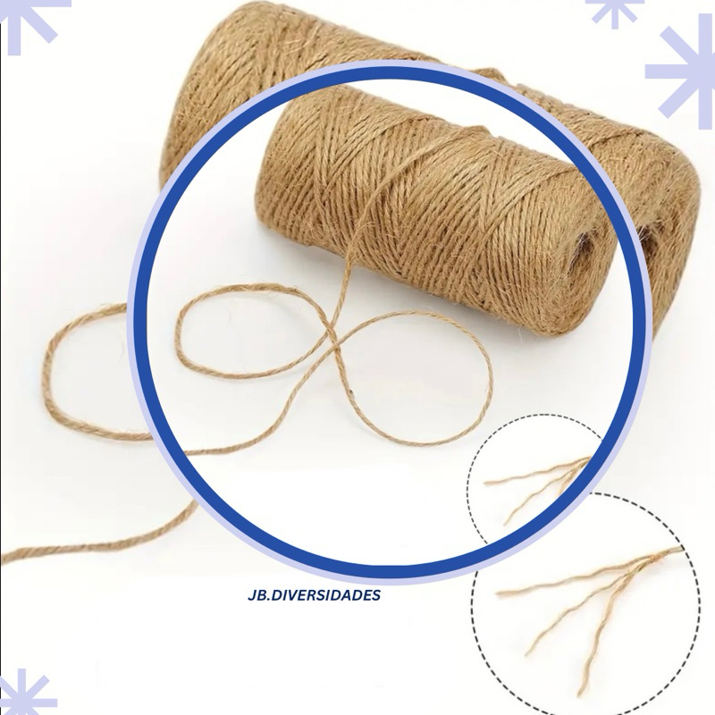 Fio De Juta para Lembrancinha Artesanato kit 10M / 20 / 100 Metros Cordão De Juta Indicado para amarrações de cargas, madeiras, artesanato, lembrancinhas e em agropecuárias. Possui cordas 100% naturais e resistentes aos raios UV 🔩 Características Técnicas -Alta resistência a tração -Flexibilidade para trabalhos manuais -Fácil de cortar e manusear -Pode ser tingido artesanalmente -Suporta pequenos pesos em embalagens e artesanato -Não solta fios facilmente 🎯 Aplicações Indicadas -Artesanato e DIY -Amarração de presentes, tags e embalagens -Decoração rústica, festas e eventos -Jardinagem (amarração de plantas) -Confecção de laços, puxadores, cordões e alças -Trabalhos escolares e scrapbook -Design sustentável e decoração natural 🌱 Vantagens Ambientais ✔ Produto ecológico e biodegradável ✔ Produzido a partir de fibra vegetal renovável ✔ Alternativa sustentável para fios sintéticos 🛠️ Cuidados e Armazenamento -Manter em local seco e ventilado -Evitar exposição direta à umidade -Proteger do sol intenso para manter a cor natural