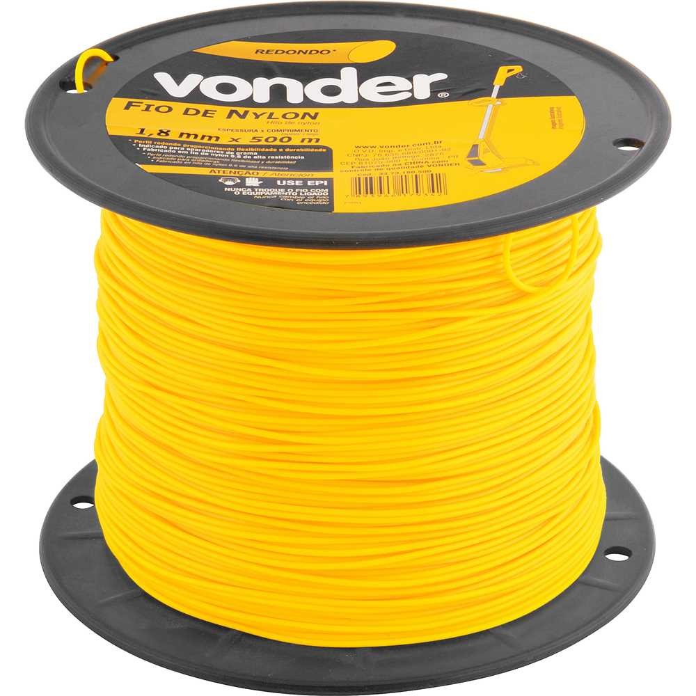Fio De Nylon, 1,8 Mm X 500 M, Redondo, Vonder Fabricado em fio de nylon 6.6 de alta resistência, perfil redondo proporcionando flexibilidade e durabilidade. Indicado para aparadores de grama. Especificações Técnicas: Espessura do fio: 1,8 mm Perfil do fio: Redondo Comprimento do fio: 500 m Cor do fio: Amarelo Massa aproximada (peso) (kg): 1,8 kg Conteúdo da Embalagem: 1 Rolo de fio de nylon com 500 m.