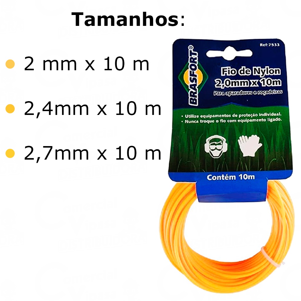 COMERCIAL VIPASA DISTRIBUIDORA Fio de Nylon para Aparadores e roçadeira de grama 2,0 mm - 2,4 mm - 2,7 mm com 10 metros - BRASFORT Fio de Nylon de Alta Resistência Flexibilidade e durabilidade Ideal para aparadores e roçadeiras de grama Tamanhos: - 2,0 MM X 10 Metros - 2,4 MM X 10 Metros - 2,7 MM X 10 Metros O Fio de Nylon para Aparadores, Cortadores e Roçadeiras de Grama da Brasfort é um acessório essencial para a manutenção de gramados, jardins e áreas verdes. Material Resistente: Fabricado em nylon de alta qualidade, o fio oferece resistência e durabilidade para cortar eficientemente a grama, ervas daninhas e vegetação densa. Diâmetros Variados: Disponível em diferentes diâmetros, como 2,0 mm, 2,4 mm e 2,7 mm, para atender às diversas necessidades de corte e às especificações dos diferentes tipos de cortadores e roçadeiras. Comprimento Adequado: Cada rolo do fio de nylon possui 10 metros de comprimento, proporcionando uma quantidade suficiente para várias sessões de corte e manutenção do gramado. Compatibilidade: Projetado para ser compatível com uma ampla gama de cortadores, aparadores e roçadeiras de gramado disponíveis no mercado, garantindo versatilidade de uso. Desempenho Eficiente: O fio de nylon é projetado para cortar a grama de forma eficaz e precisa, proporcionando um acabamento limpo e uniforme em áreas de difícil acesso ou onde o cortador de grama tradicional não consegue alcançar. Aplicações Versáteis: Adequado para uso em gramados residenciais, parques, jardins, áreas públicas e comerciais, bem como para projetos de paisagismo e jardinagem em geral. Instalação Simples: Fácil de instalar e substituir, o fio de nylon pode ser rapidamente carregado no cortador ou roçadeira, permitindo que os usuários realizem a manutenção do gramado com facilidade e rapidez. Segurança: O fio de nylon é uma opção mais segura em comparação com lâminas metálicas, pois reduz o risco de danos acidentais a objetos sólidos e estruturas próximas durante o processo de corte. Economia: Comprar o fio de nylon em rolos permite aos usuários economizar dinheiro em comparação com a compra de lâminas de reposição, além de oferecer a conveniência de ter um suprimento adicional disponível sempre que necessário. COMERCIAL VIPASA DISTRIBUIDORA