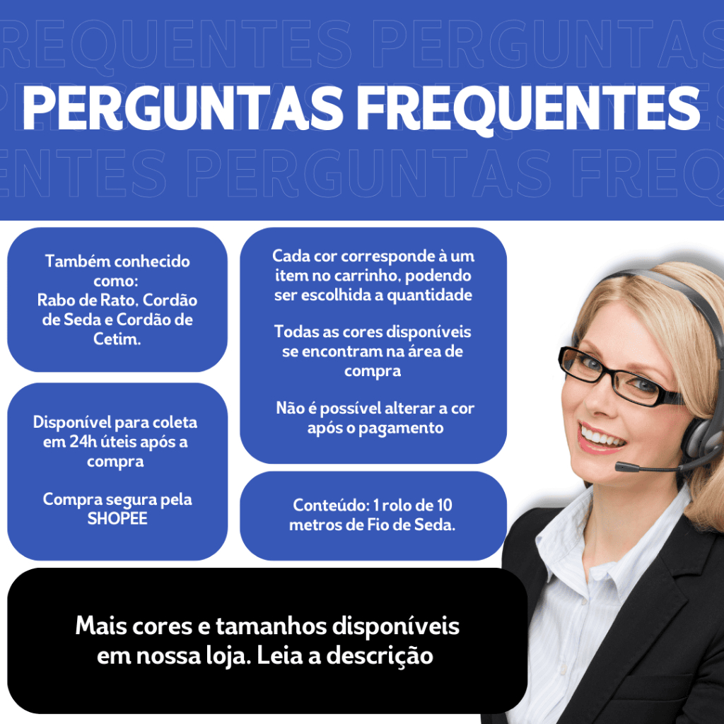 Seja Bem-vindo! Avisos e Informações: -Envio direto de São Paulo! -Produto pronto para entrega. -Envio rápido! -Nota fiscal de venda inclusa. Fio de seda de alta qualidade, com 50 metros de comprimento e 2.0 mm de espessura. Conhecido como "Cordão Rabo De Rato", é ideal para diversas aplicações, como artesanato, costura e decoração. - Material: Seda de alta qualidade. - Comprimento: 50 metros. - Espessura: 2.0 mm. - Cor: Disponível em diversas cores. * O fio de seda é resistente e durável. * Flexível e fácil de trabalhar. * Fio de seda adiciona um toque de elegância às suas criações. * Use o fio de seda para criar peças únicas e personalizadas. * Utilize o fio de seda para costurar roupas e acessórios.