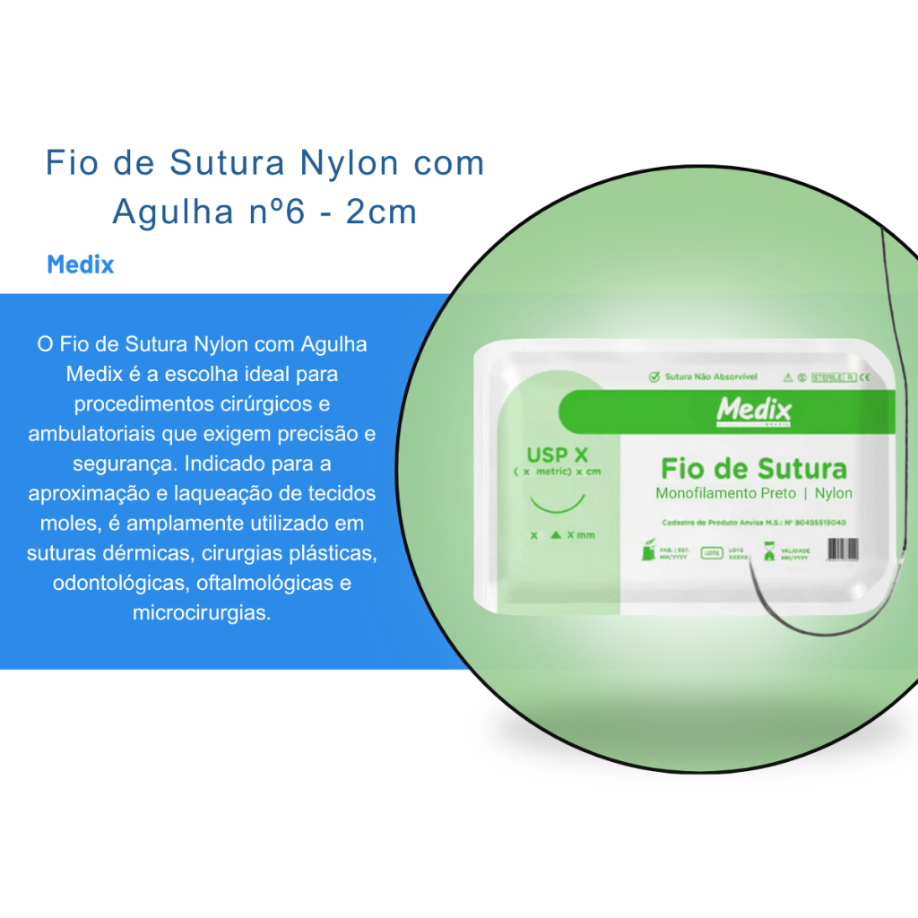 Fio de Sutura Nylon com Agulha nº6 - 2cm Preto - Medix O Fio de Sutura Nylon com Agulha Medix é a escolha ideal para procedimentos cirúrgicos e ambulatoriais que exigem precisão e segurança. Indicado para a aproximação e laqueação de tecidos moles, é amplamente utilizado em suturas dérmicas, cirurgias plásticas, odontológicas, oftalmológicas e microcirurgias. Características do Produto: Versatilidade e Eficiência: Perfeito para uma ampla variedade de procedimentos médicos. Alta Qualidade: Fios não absorvíveis que oferecem segurança e precisão, com necessidade de remoção entre 7 a 10 dias após a aplicação. Prático e Seguro: Esterilizado e pronto para uso, garante um procedimento seguro e eficaz. Cor Preta: Facilita a visualização durante o processo. Orientações de Uso: Seleção Adequada: Escolha o modelo e tamanho corretos para o procedimento. Abertura Estéril: Abra o envelope de maneira estéril para preservar a integridade Inspeção: Verifique a embalagem antes de abrir. Não utilize se houver sinais de danos ou violação. Preparação: Posicione o fio em uma porta-agulhas sobre uma superfície estéril. Aplicação: Realize uma sutura utilizando técnicas cirúrgicas adequadas, garantindo nós "chatos" e "quadrados" conforme necessário. Descarte Responsável: Após o uso, descarte o fio no lixo hospitalar, seguindo as normas de segurança sanitária. Cuidados Especiais: Uso Único: Este fio foi projetado para uma única utilização. Armazenamento Correto: Conservar em local limpo, seco e protegido da luz e umidade. Verificação: Não utilize o produto se a embalagem estiver danificada ou violada. Especificações Técnicas: Marca: Medix Modelo: Fio de Sutura Nylon com Agulha Tamanho: nº6 - 2cm Cor: Preto Registro ANVISA: 80495519040 Itens Inclusos na Embalagem: 1 Envelope Fio de Sutura Nylon com Agulha - Medix O Fio de Sutura Nylon Medix combina qualidade, precisão e segurança para garantir o sucesso de seus procedimentos cirúrgicos e ambulatoriais. Dúvidas Frequentes: P:O que é o Fio de Sutura Nylon com Agulha - Medix? R: O Fio de Sutura Nylon com Agulha - Medix é um material médico necessário para fechamento de tecidos, proporcionando resistência e segurança durante procedimentos. P: Para que tipos de procedimentos ele é indicado? R: É indicado para procedimentos de sutura em geral, incluindo cirurgias, procedimentos ambulatoriais e emergências médicas. P: Quais são as vantagens do fio de nylon? R: O fio de náilon é monofilamentar, garantindo menor risco de infecção, alta resistência e fácil conexão durante a sutura. P: O já vem com agulha? R: Sim, o fio de sutura já acompanha uma agulha afiada e resistente, pronta para uso. P: É um produto estéril? R: Sim, o Fio de Sutura Nylon com Agulha - Medix é esterilizado e embalado individualmente para garantir a segurança e a higiene.