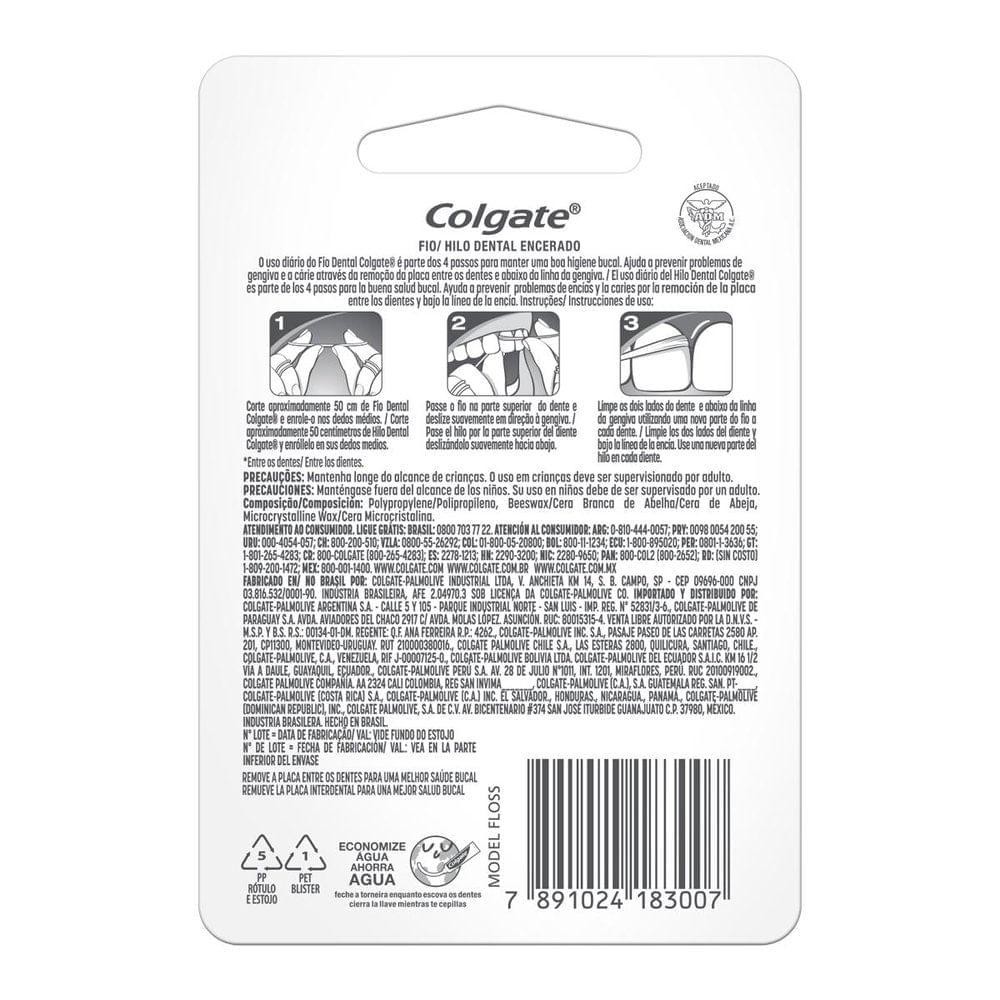 *Produto Original* *Atenção:* Venda exclusiva para pessoa física. Pedidos com CNPJ serão cancelados. O Fio Dental Colgate proporciona limpeza profunda e suave. Além disso, esse fio dental ajuda a remover as placas e desliza facilmente entre os dentes. Use diariamente o Fio Dental Encerado Colgate para você ter uma melhor saúde bucal. C/esse Fio Dental Colgate na sua rotina, você ajuda a prevenir problemas de gengiva e cárie, removendo a placa entre os dentes, onde as escovas de dente não conseguem alcançar. Benefícios: Desliza entre os dentes: criado para deslizar facilmente entre os seus dentes, deixando mais simples a sua rotina de higiene bucal. Evita desfiamento: desenvolvido para evitar o desfiamento na hora da limpeza interdental. Gengiva saudável: ajuda a manter a gengiva saudável por meio da remoção de placa entre os dentes, onde a escova de dentes não alcança. E não se esqueça: use fio dental diariamente para uma melhor saúde bucal. Composição: Polipropileno, Cera Branca de Abelha, Cera Microcristalina. Modo de uso: O Fio Dental Colgate é fácil de usar, veja só: 1. Corte aproximadamente 50cm e enrole-o nos dedos médios. 2. Passe o fio na parte superior do dente, deslizando suavemente em direção à gengiva. 3. Limpe os dois lados do dente e abaixo da linha da gengiva, utilizando uma nova parte do fio a cada dente.