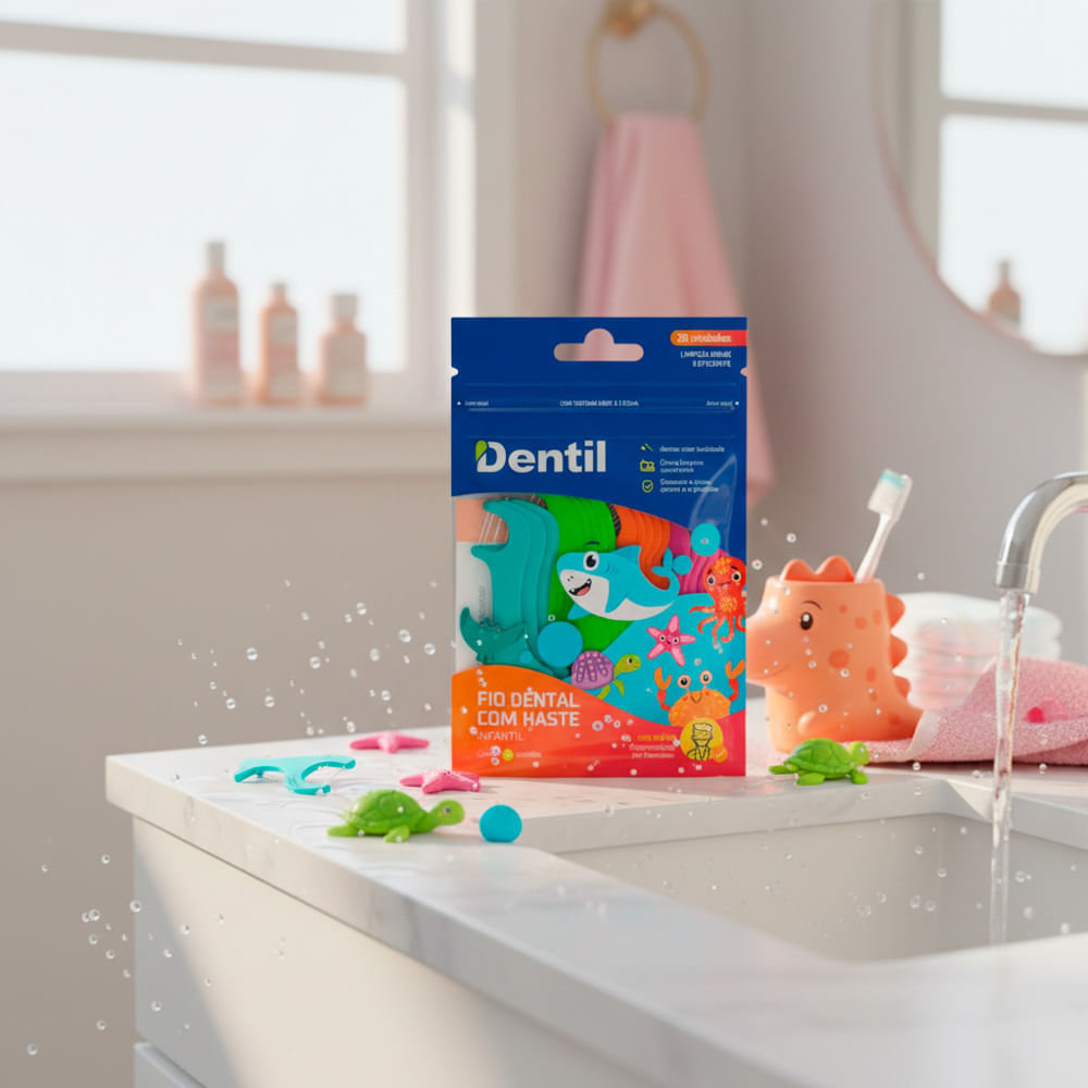 Fio Dental com Haste Infantil Dentil – 20 Unidades com Formatos Divertidos Diversão e Proteção para o Sorriso dos Pequenos Transforme a hora de cuidar dos dentes em um momento de brincadeira com o Fio