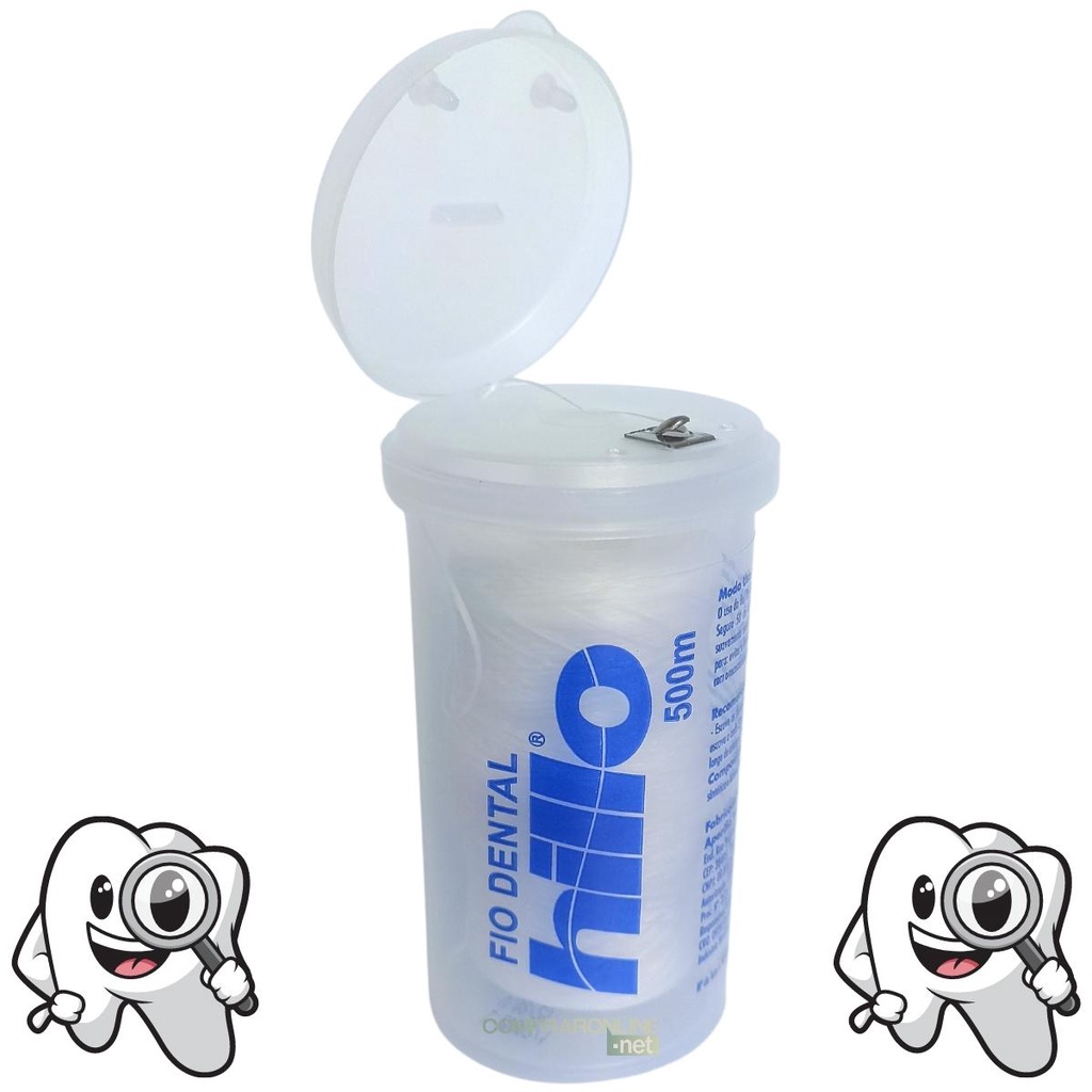 Fio Dental Hillo 1000 Metros Kit 2 Rolos Odontológico Promoção. O fio dental hillo possui várias torções em seus micros filamentos, garantindo maior resistência ao desfiamento. O uso regular do fio ou fita dental hillo auxilia na prevenção de cárie, doença periodontal e mal hálito. A utilização do fio dental é importante para obter-se uma completa higiene bucal, pois remove resíduos alimentares e placa bacteriana entre os dentes, onde as escovas não alcançam. Instruções de uso: Corte aproximadamente 50 centímetros de fio dental. Enrole a maior parte do fio em um dos dedos médios e o restante no dedo médio da outra mão que vai segurar a parte usada do fio. Segure o fio entre os dedos indicador e polegar, deslize-o entre os dentes suavemente até a linha da gengiva. Curve-o contra a lateral do dente formando um "C", friccione a lateral do dente, movendo o fio da gengiva para a extremidade do dente. Use um pedaço limpo de fio para cada dente. Recomendações: Use o fio dental diariamente, visite seu dentista regularmente e mantenha fora do alcance de crianças. Composição: Resina termoplástica, paraffin, paraffinum liquido, aroma, bht e menthol. Itens inclusos: 2 - rolos de fio dental hillo 500 metros cada.