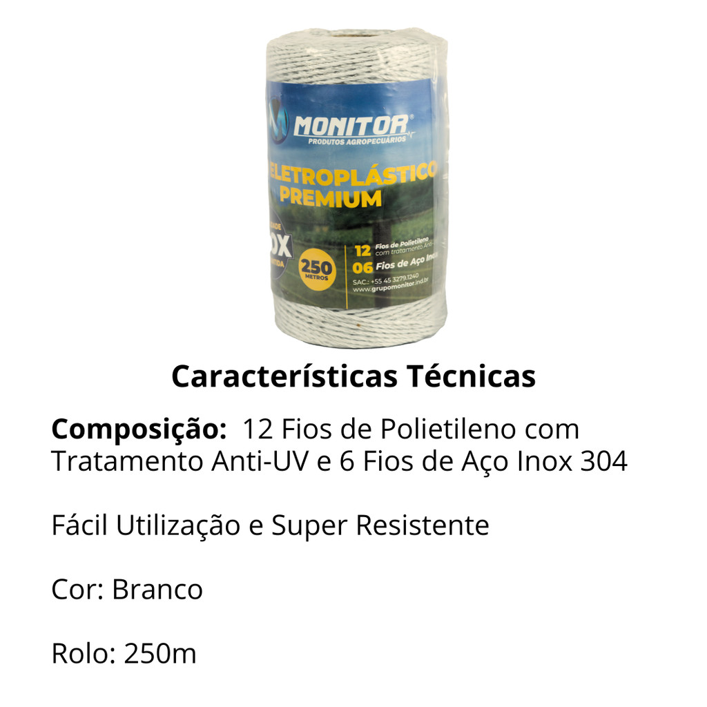 Fio Eletroplástico Trançado p/ Cerca Elétrica Rural 12x6 250m Branco Monitor Nosso objetivo é fazer o cliente ter uma experiência completa com o produto por meio dos nossos anúncios, proporcionando confiança e satisfação em sua compra. Fundado no início da década de 80, o Grupo Monitor vem atuando em importantes atividades principalmente na área de eletrificação rural O fio eletroplástico trançado é um produto altamente resistente e prático. É composto por fios de polietileno na cor branca com tratamento anti-uv e trançado com arames de aço inox. Por ser muito fácil em manusear, é ideal para divisão de piquetes, além de ser muito durável. Características Técnicas: Aplicação: divisão de piquetes Contém: proteção contra raios ultra-violeta (anti-uv) Composição: 12 fios polietileno (virgem) Composição: 6 fios de aço inoxidável Cor: Branco Metragem: rolo com 250 metros Embalagem: 1 unidade