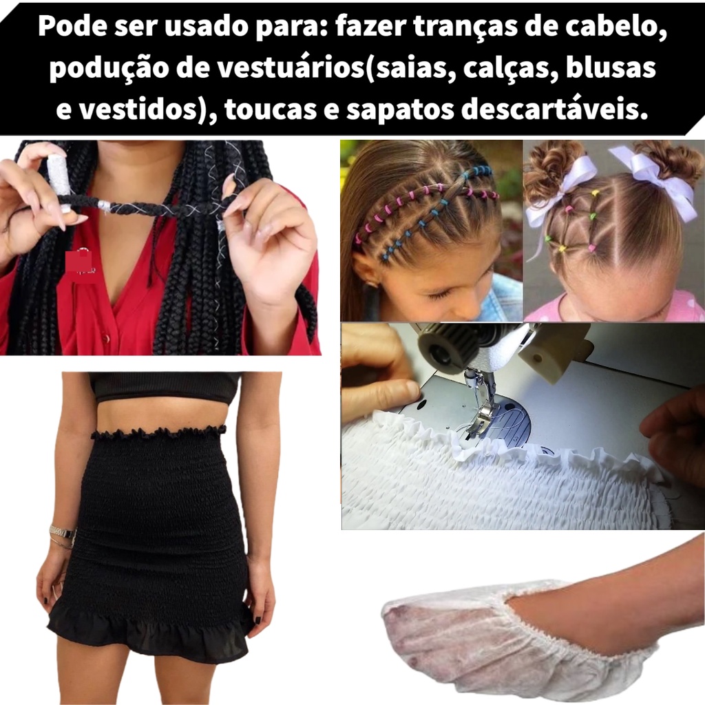 TRANÇA DE CABELO E BOX BRAIDS E MEGA HAIR? O lastex atualmente é muito utilizado pelos cabeleireiros na produção de tranças em cabelos. Se quer ficar ainda mais linda e elegante o lastex é um itém ideal para produção do seu cabelo. Lastex ou Elastex como preferir chamar é um fio elástico utilizado também nas confecções de vestuários, como saias, tops, camisas, proporcionando o franzido, que pode ser observado em inúmeras peças atuais e em detalhes das mesmas, como golas, barras de calça, mangas, punhos, na cintura, e por aí vai. Dessa forma a roupa se torna simples em criativa, elegante e fashion através destes mínimos detalhes. Também é utilizado para confecção de itens decorativos para a casa, como cortinas e outros artesanatos. Ele também cumpre um excelente papel como um bom substituto do fio elástico propriamente dito, pois garante um franzido único que estica e retorna para o lugar em certas ocasiões. E é por conta disso que é importante medir com precisão a quantidade de tecido a ser posta na confecção, pois o material faz com que o tecido reduza de tamanho ao ser esticado. Era bastante utilizado em peças íntimas como cintas e espartilhos, além de roupas infantis, certos tipos de decotes, decorações para casa, dentre outros. Atualmente, retornou ao mercado de moda em cabelo(Trança e Box Braids) e moda em peças com uma estética leve e sofisticada de forma simples, com modelagens infladas e tecidos delicados - extremamente utilizados durante o verão. Mas isso não significa que as peças confeccionadas com este material só possam ser utilizadas em determinado evento! Muito pelo contrário, sua maior vantagem é a sua versatilidade e servem para qualquer ocasião, com looks mais leves e românticos pelas suas estampas e cores. Há diversos tipos de roupas e composições que podem ser criados com lastex! BLUSAS É extremamente importante ter no armário uma blusa de lastex, pois além de ser versátil e prática, é bastante confortável e combina com qualquer look! Há peças de inúmeras cores e estampas, de amarração nas costas e é ideal para quem ama roupas leves e românticas. VESTIDOS Da mesma forma que as blusas, os vestidos se apresentam como peças extremamente leves e ideais para qualquer ocasião da estação! Também é uma peça bem versátil e com uma enorme variedade de cores e estampas. CALÇAS JEANS Os jeans, de certa forma, não são confeccionados diretamente com o lastex, mas seus detalhes sim! E eles combinam perfeitamente em qualquer ocasião e com qualquer visual. Extremamente elegante e sofisticado, o que garante maior presença em inúmeros eventos sociais. - FICHA TÉCNICA: Comprimento: 10 metros Código do Produto: REAL Fabricante: Lastex Composição: 59% Elastodieno, 41% Poliéster