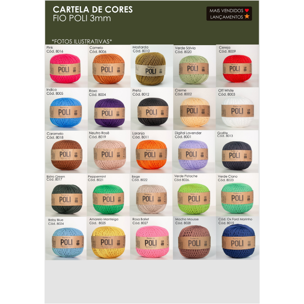 Fio Poli 3mm Fischer, ideal para crochê, tricô, macramê e artesanato em geral. Produzido em 100% poliéster, oferece excelente equilíbrio entre leveza, maciez e estrutura, garantindo peças firmes e com ótimo acabamento. Com espessura uniforme de 3mm, é fácil de trabalhar e proporciona alto rendimento, sendo muito utilizado em peças modernas e funcionais. Indicado para bolsas, sousplat, cestos, cachepôs e decoração. Detalhes do produto: • Espessura: 3mm • Metragem: aproximadamente 220m • TEX: 1360 (fio estruturado, leve e resistente) • Peso: cerca de 250g a 300g • Composição: 100% poliéster • Agulha recomendada: crochê 2,0mm a 4,5mm | tricô 2,5mm a 6,0mm • Cores: ampla cartela disponível (diversas opções) Produto ideal para quem busca leveza, resistência e acabamento moderno nas peças. A cor do produto pode variar de acordo com as configurações do seu monitor.