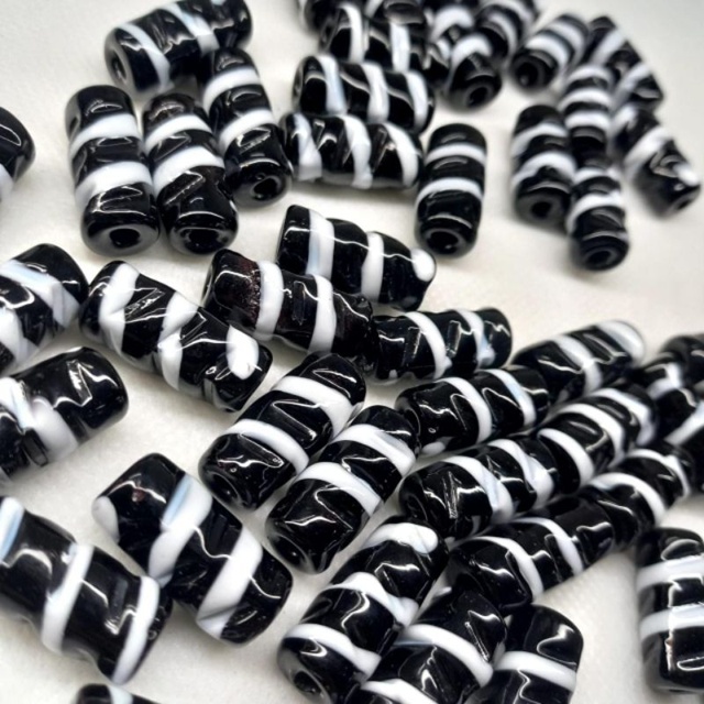 Firma Preta Com Rajado Branco 10 Unidades Material : Murano Tamanho aproximado de cada peça : 2,2 cm x 1,1 cm Obs. : O trabalho é manual, portanto, o tamanho e as cores podem ter leve alteração.