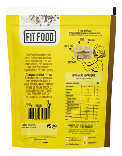 Biscoito de Arroz com Quinoa e Linhaça Fit Food, embalagem de 90g. Este produto é uma opção saudável e nutritiva, ideal para quem busca um lanche leve e saboroso. Enriquecido com quinoa e linhaça, é uma excelente fonte de fibras e proteínas. Não contém glúten, sendo uma alternativa perfeita para celíacos ou para aqueles que desejam reduzir o consumo dessa proteína. Além disso, é livre de conservantes e corantes artificiais, garantindo um snack natural e benéfico para sua alimentação.