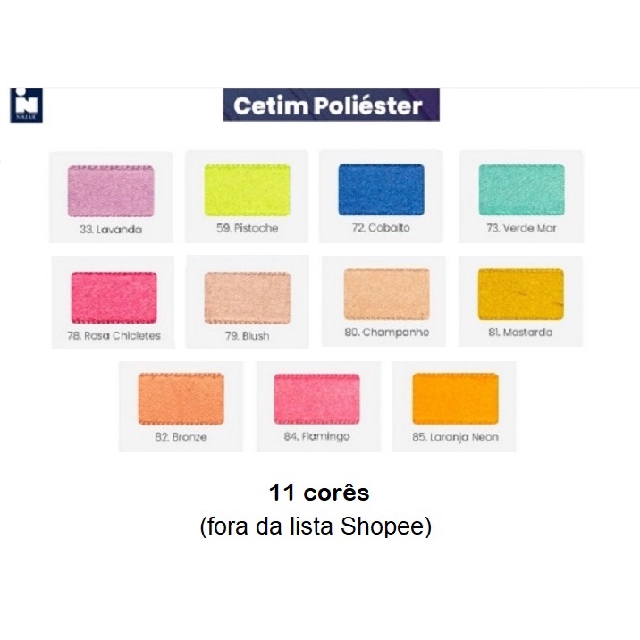 Fita Najar Cetim Face Dupla Lisa Nº 9 Metragem: 10 metros por peça Largura da fita: 3 mm Composição: 100% Poliester (PES) Fita de excelente qualidade, com lindas cores Fabricada com fio de poliéster, ela tem um toque super macio. Com 61 lindas cores, a fita Najar é indicada para confecção de laços, tiaras, em bordados, roupas femininas, masculinas. infantis e de adultos. Em acessórios de moda, para passar laços em caixas e embalagens para presentes, e tantos outros artigos de decoração, arranjos e artesanato em geral. Também em trabalhos de scrapdecor, scrapbook e patchwork. Perfeita para quem busca um excelente resultado em seus trabalhos. -IMPORTANTE: O primeiro catálogo se refere às 50 cores que estão disponíveis na plataforma para escolha. O catálogo seguinte se refere às 11 cores que ficaram fora da plataforma. Caso você deseje algumas dessas 11 cores, você deve selecionar a cor BRANCA , e em seguida informá-las no campo de mensagens ao comprador com as respectivas quantidades.