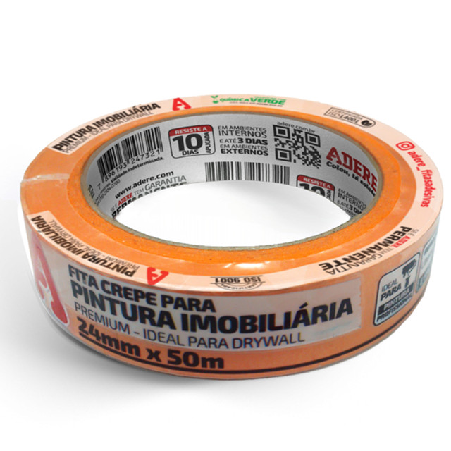 A crepe laranja é uma fita adesiva premium ideal para quem procura praticidade e qualidade em um só produto. Com dorso de papel crepado tratado com solução a base borracha e coberto com adesivo a base de borrachas e resinas, proporcionam maior resistência, possibilitando a sua utilização em diversas superfícies não deixando resíduo após a sua remoção. Sua cor laranja se destaca no mascaramento e proteção da pintura residencial, facilitando sua identificação durante o trabalho e possibilitando sua aplicação em superfícies como drywall com acabamento profissional. Com configuração inovadora permite que fique aplicado por até 10 dias em ambientes internos, protegidos da luz solar, sem perder as características de adesividade e facilidade na remoção mesmo em temperaturas mais baixas. Em ambientes externos pode ainda ser aplicada e exposta a intempéries por até 3 dias, resistindo a sol e chuva, sem prejudicar a aplicação. Marca: Adere Modelo: A128RLS Linha: Imobiliaria Propriedades: Cor da fita: Laranja Espessura da fita: 0,122 mm +/- 0,022 mm Temperatura mínima de aplicação: 15º C Resistência à temperatura: 100º C até 1 hrs Estocagem: Na embalagem original, em ambiente coberto, seco e temperatura ambiente. Nessas condições nosso produto possui garantia permanente e validade indeterminada. Embalagem sensível a umidade e luz solar direta. Condição de uso: Aplicar o produto sobre a superfície limpa, seca, isenta de pó, sujeira ou contaminantes. Recomendamos que testes prévios sejam efetuados com a finalidade de se obter o melhor desempenho do produto na aplicação desejada. Aplicações Típicas: Mascaramento de pintura imobiliária Utilizada para pinturas imobiliárias, em superfícies irregulares, fixação e emendas de papéis ou plásticos, marcação, vedação de embalagens, etc. 01 Fita Crepe Imobiliária Laranja 24mmx50m Adere