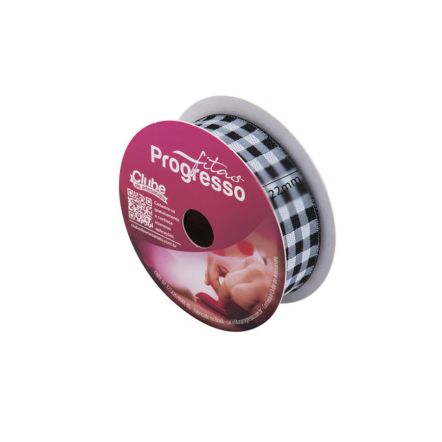 Fita de Cetim 10m x 22mm - Cor 219 - Xadrez Preto - Rolo 10 metros - 1 unidade - Progresso - Rizzo