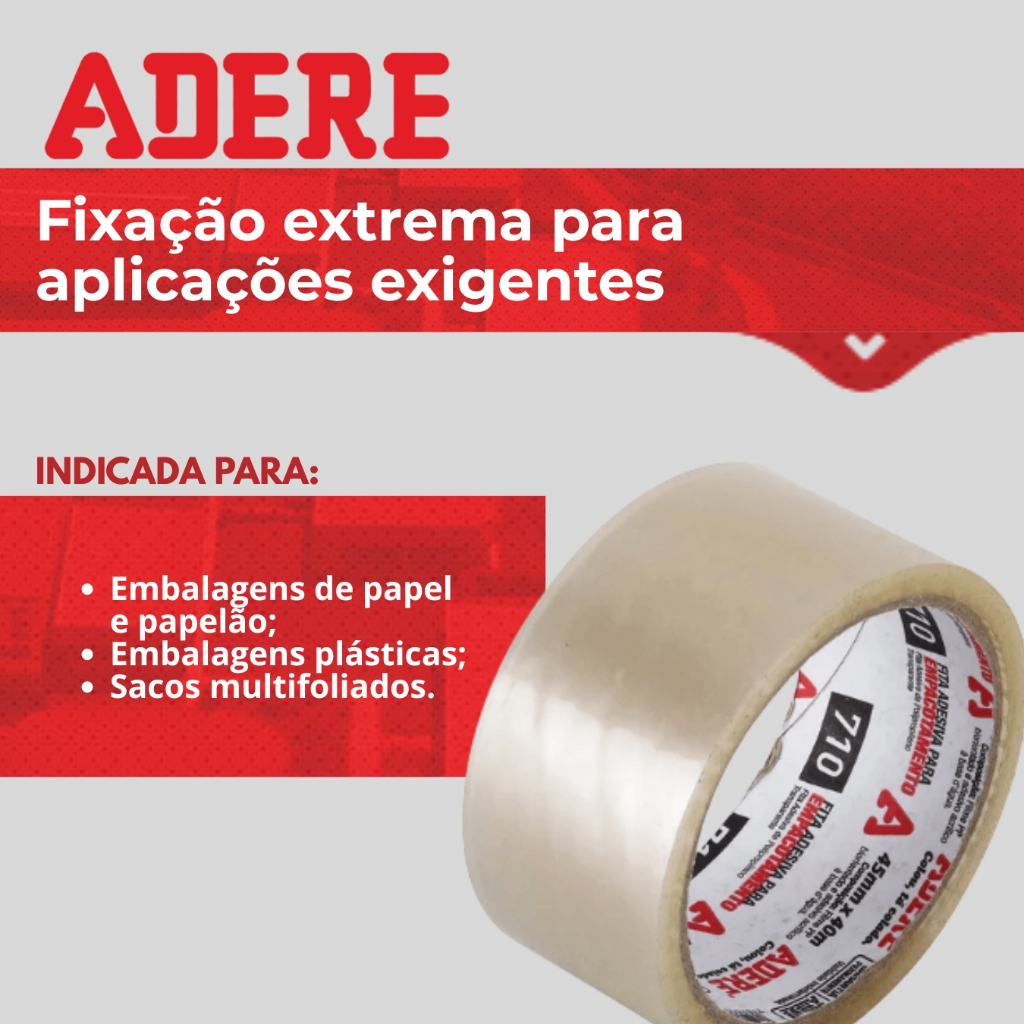 A Fita de Empacotamento 710 Transparente da marca Adere é a solucao ideal para suas necessidades de embalagem. Com 45 mm de largura e 40 m de comprimento, esta fita é perfeita para garantir a seguranca e a integridade de suas caixas e embalagens. Fabricada em polipropileno, possui uma espessura de 1 mm e acabamento brilhante, proporcionando uma adesao forte e duradoura.Recomendada para superfícies como papelao, plásticos e sacos poli folhados, esta fita é versátil e eficaz em diversas aplicacoes. Sua transparencia permite que a embalagem mantenha uma aparencia limpa e profissional, ideal para uso em ambientes comerciais e pessoais. A Fita de Empacotamento Adere é a escolha certa para quem busca qualidade e eficiencia em suas tarefas de embalagem......................................................................................................................................IMAGENS MERAMENTE ILUSTRATIVAS.....................................................................................................................................DÚVIDAS FREQUENTES.....................................................................................................................................Pergunta: Como é embalado o produto?Resposta: Todos os nossos produtos vendidos são embalados em caixas lacradas ou plástico stretch. Em respeito ao meio ambiente 90% das caixas são reutilizadas.Pergunta: Quem faz a entrega?Resposta: A entrega é terceirizada, feita via CORREIOS ou TRANSPORTADORA.Pergunta: O envio é feito em quantos dias?Resposta: Nós enviamos o seu pedido no prazo máximo de 24 horas após a confirmação de sua compra, sendo um dos envios mais rápidos da plataforma.Pergunta: Os produtos são novos ou usados?Resposta: Todos os produtos que trabalhamos são novos e com qualidade garantida......................................................................................................................................