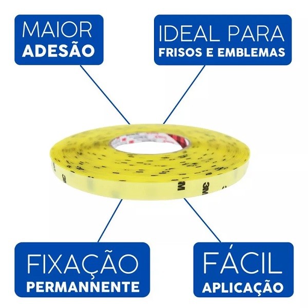 Fita dupla face transparente, produzida com espuma acrílica, possui 12mm de largura e 3m de comprimento. Ideal para fixação automotiva de friso lateral, de Claddings, de teto, fixação de Wheatherstrips, Spoilers. Fácil aplicação e com fixação permanente, possui excelente adesão em pinturas comuns, de baixa energia supercial e sistemas de pintura resistentes a riscos e danos. CARACTERÍSTICAS: - Fita dupla face - Transparente - Produzida com espuma acrílica - Fácil aplicação - Fixação permanente - Com 12mm de largura - Comprimento de 3m - Ideal para fixação de diversas peças externas ou internas em veículos