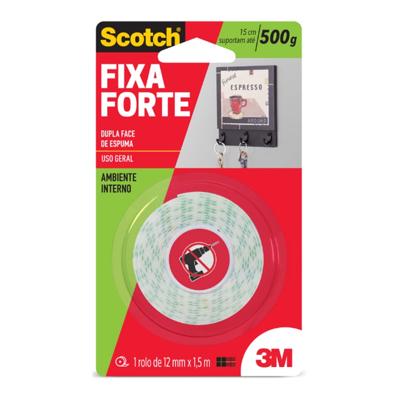 Fita dupla face espuma banana 12mmx1,5m - 3M Descrição - Fácil aplicação, sem furos e sem sujeira - Ideal para pendurar: Quadros, canaletas, espelhos e objetos de decoração - Superfície de aplicação: Azulejos, madeira selada e paredes internas - Fixação permanente - Ideal para utilização em ambientes internos. - Medida da fita: 12mm x 1,5m - Gramatura: 500g.