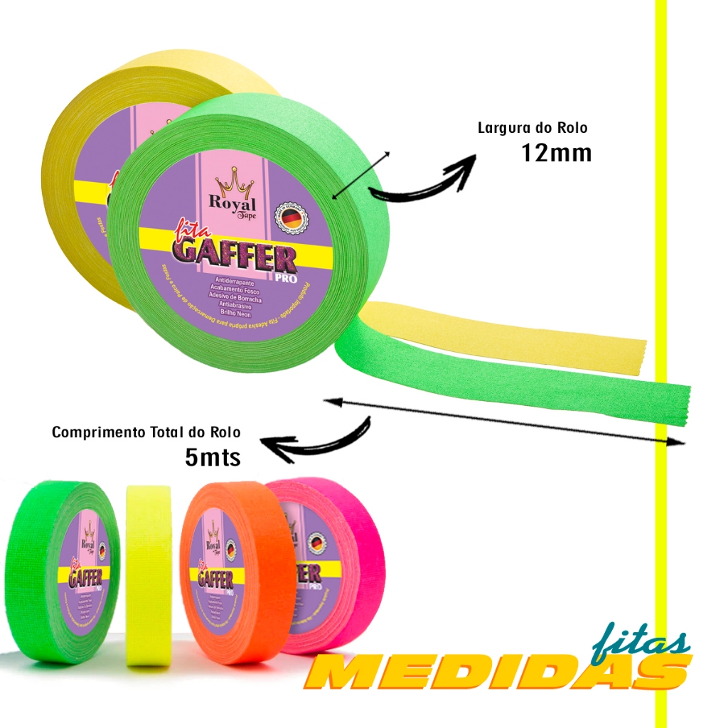 Fita Gaffer Tecido Kit 5 Cores 12mm x 5mts Efeito Neon Fluorescente Na Luz Negra Decorar Festas Balada Cha de Cozinha de Bebe Profissional Demarcaçao de Palco Eventos Sinalizaçao Nao Deixa Residuos UV Tape Reactive Blacklight Produto Original Alemanha